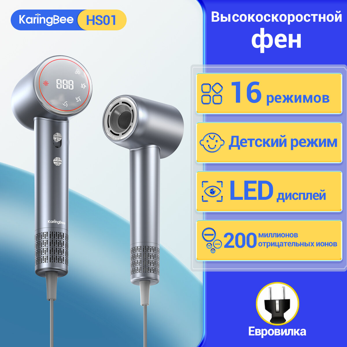 Высокоскоростной фен для волос KaringBee HS01,1500 W,LED дисплей,Серый интересное: