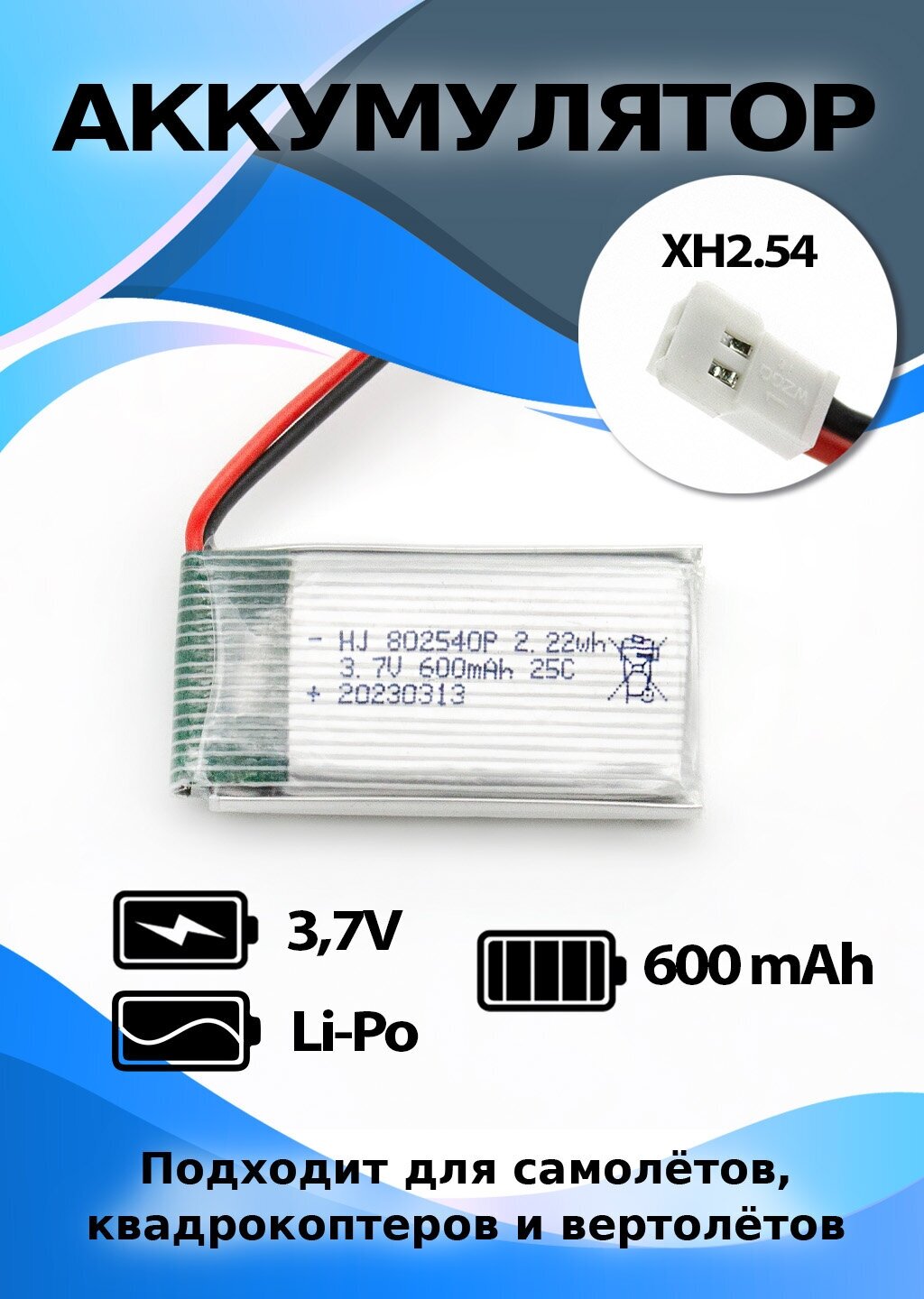 | Комплектация | Аккумулятор 3.7 V 600mAh разъем XH2.54 - 1 шт |