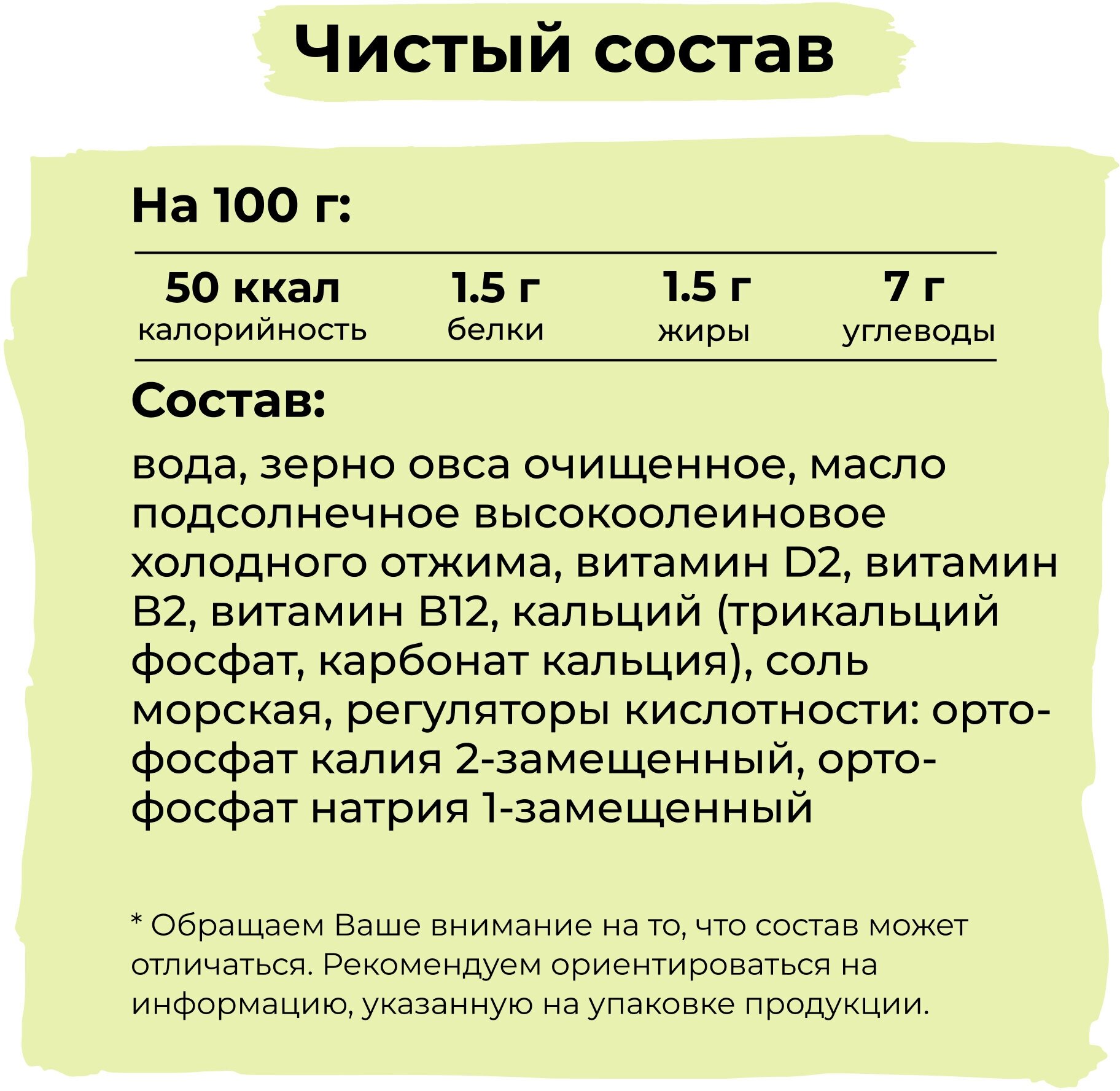 | Состав | вода, зерно овса очищенное, масло подсолнечное высокоолеиновое холодного отжима, витаминно-минеральный комплекс (витамин D2, витамин В2 (рибофлавин), витамин В12, кальций (трикальций фосфат, карбонат кальция)), соль морская, регуляторы кислотности: орто-фосфат калия 2-замещенный, орто-фосфат натрия 1-замещенный |
