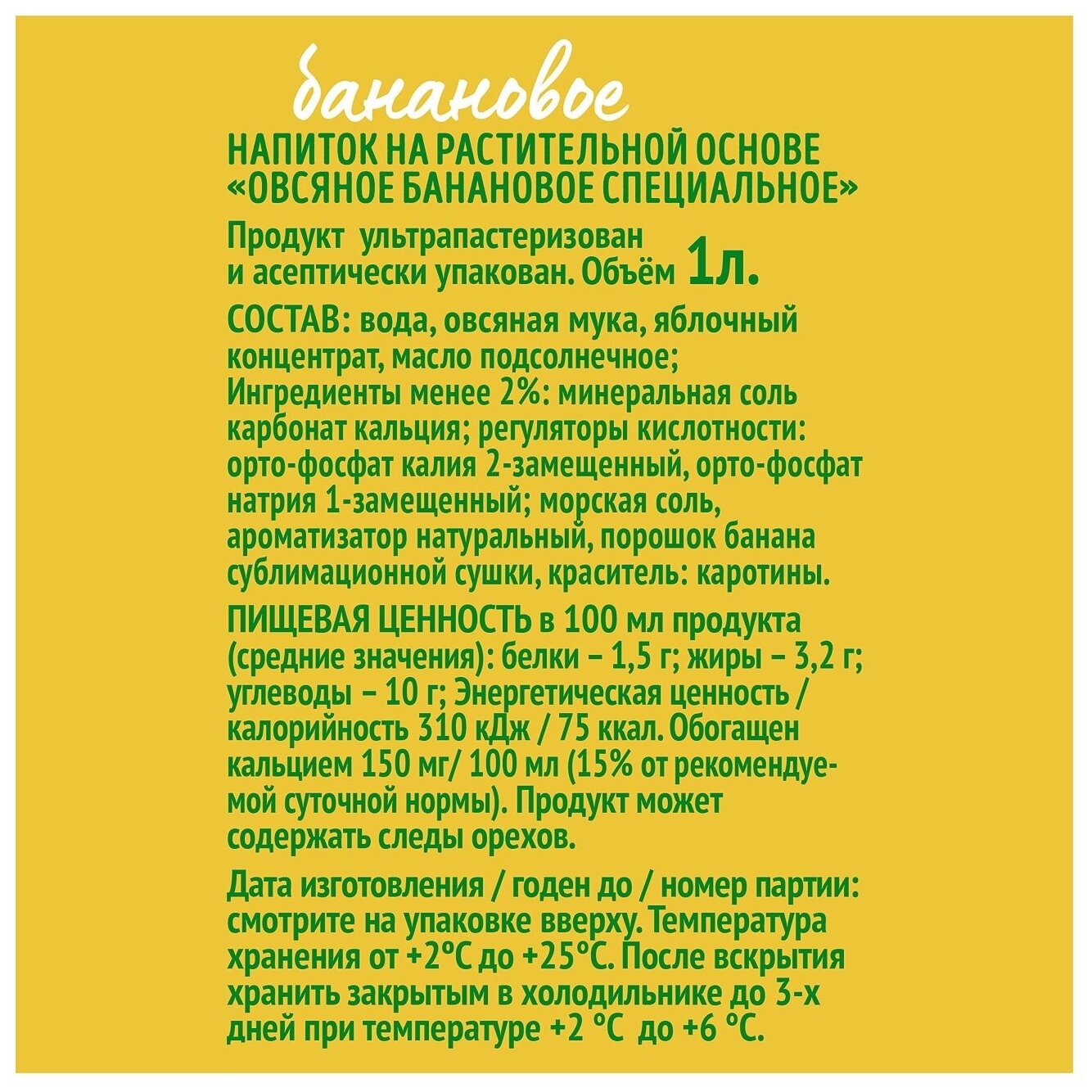 | Состав | вода, овсяная мука, яблочный концентрат, масло подсолнечное; Ингредиенты менее 2%: минеральная соль карбонат кальция; регуляторы кислотности: орто-Фосфат калия 2-замещенный, орто-Фосфат натрия 1-замещенный; морская соль, ароматизатор натуральный, порошок банана сублимационной сушки, краситель: каротины |