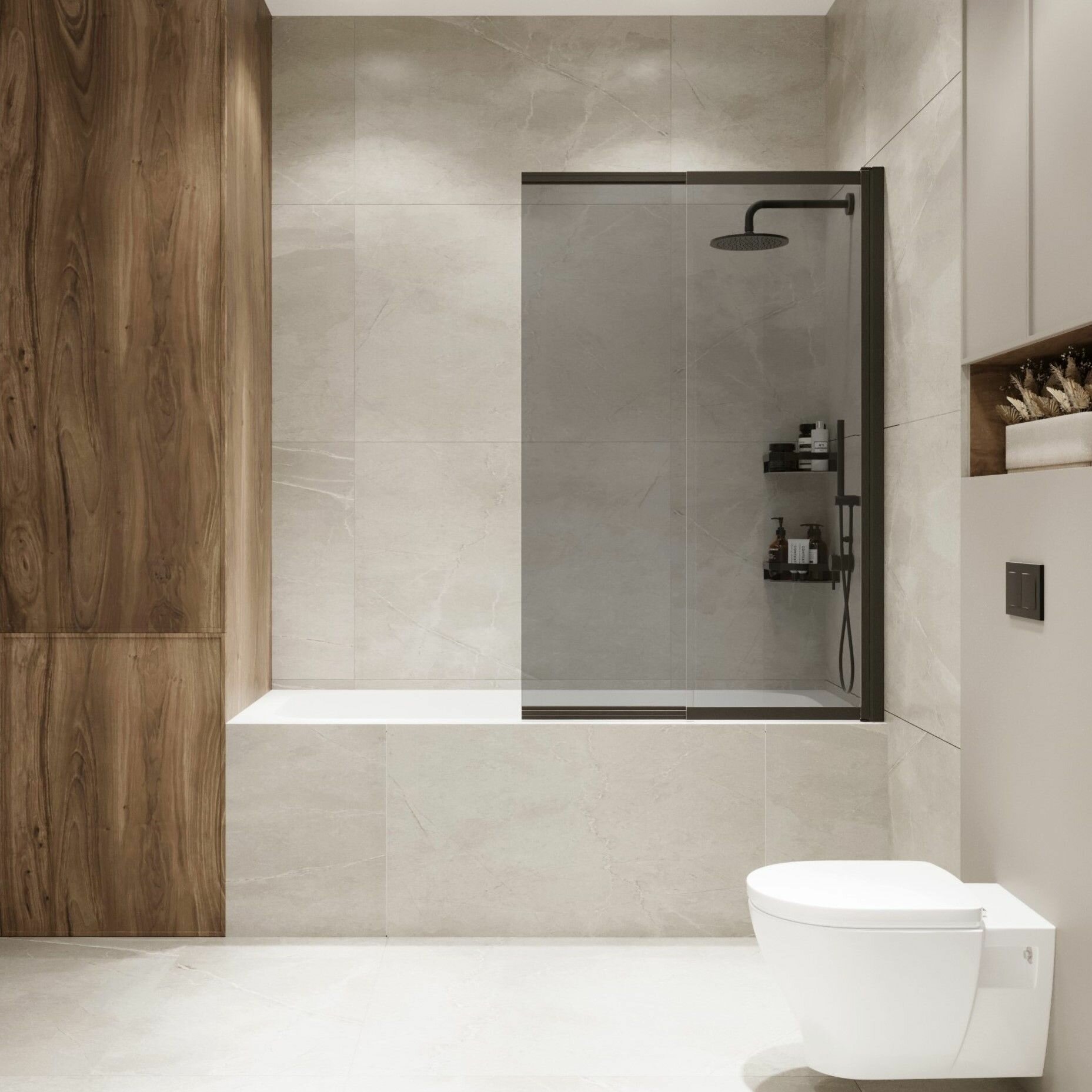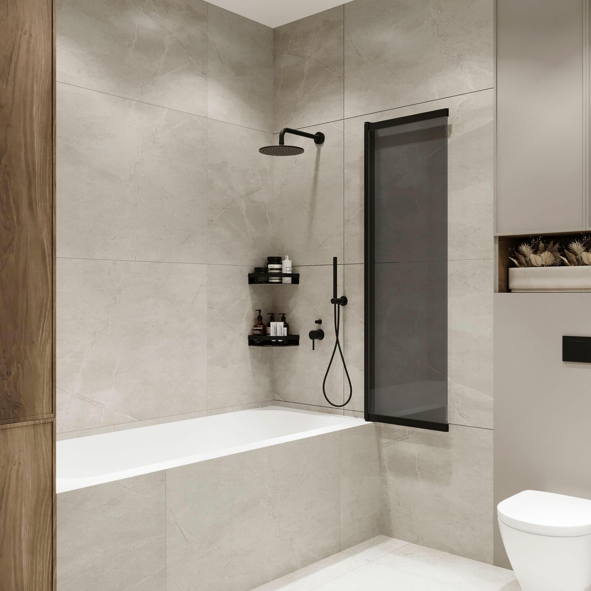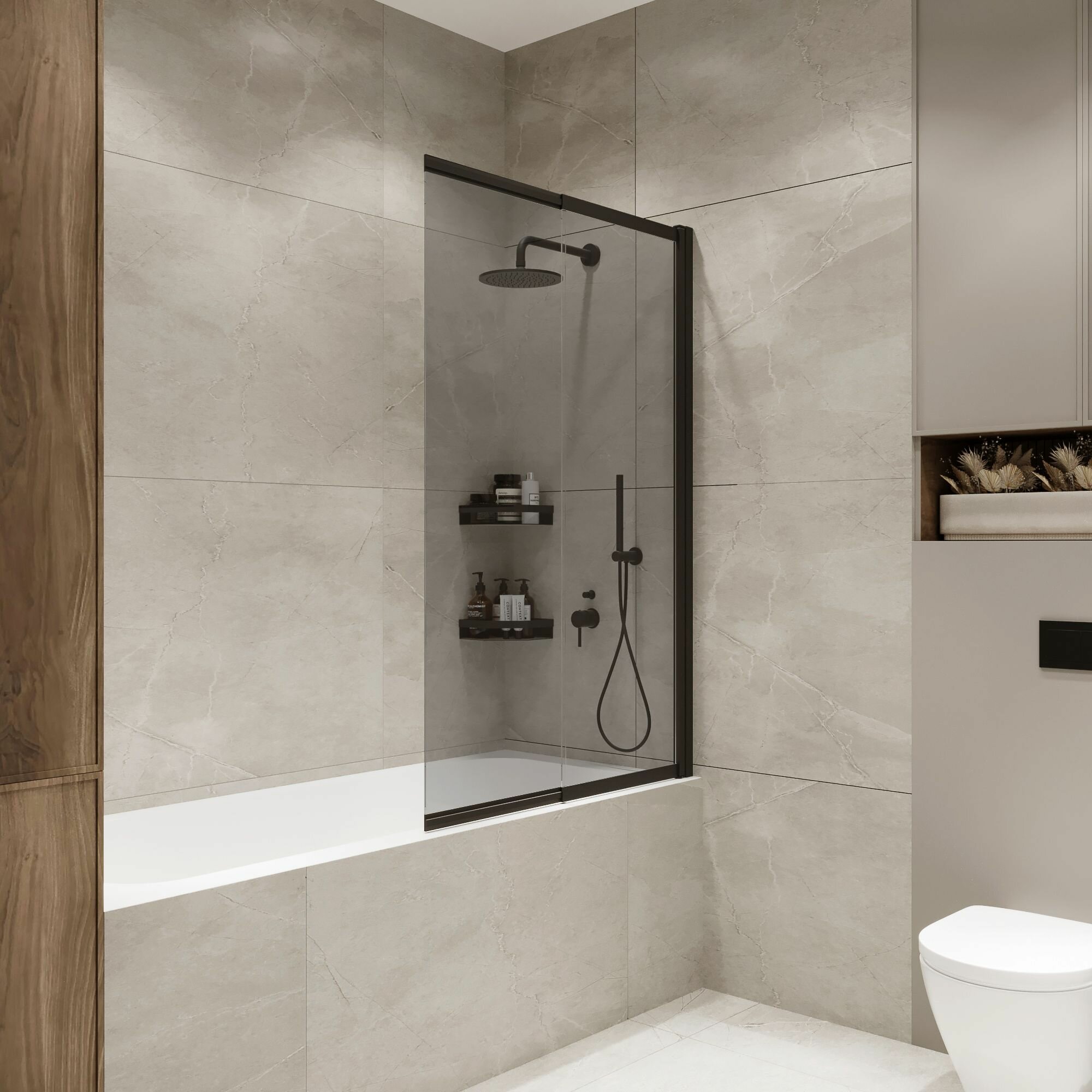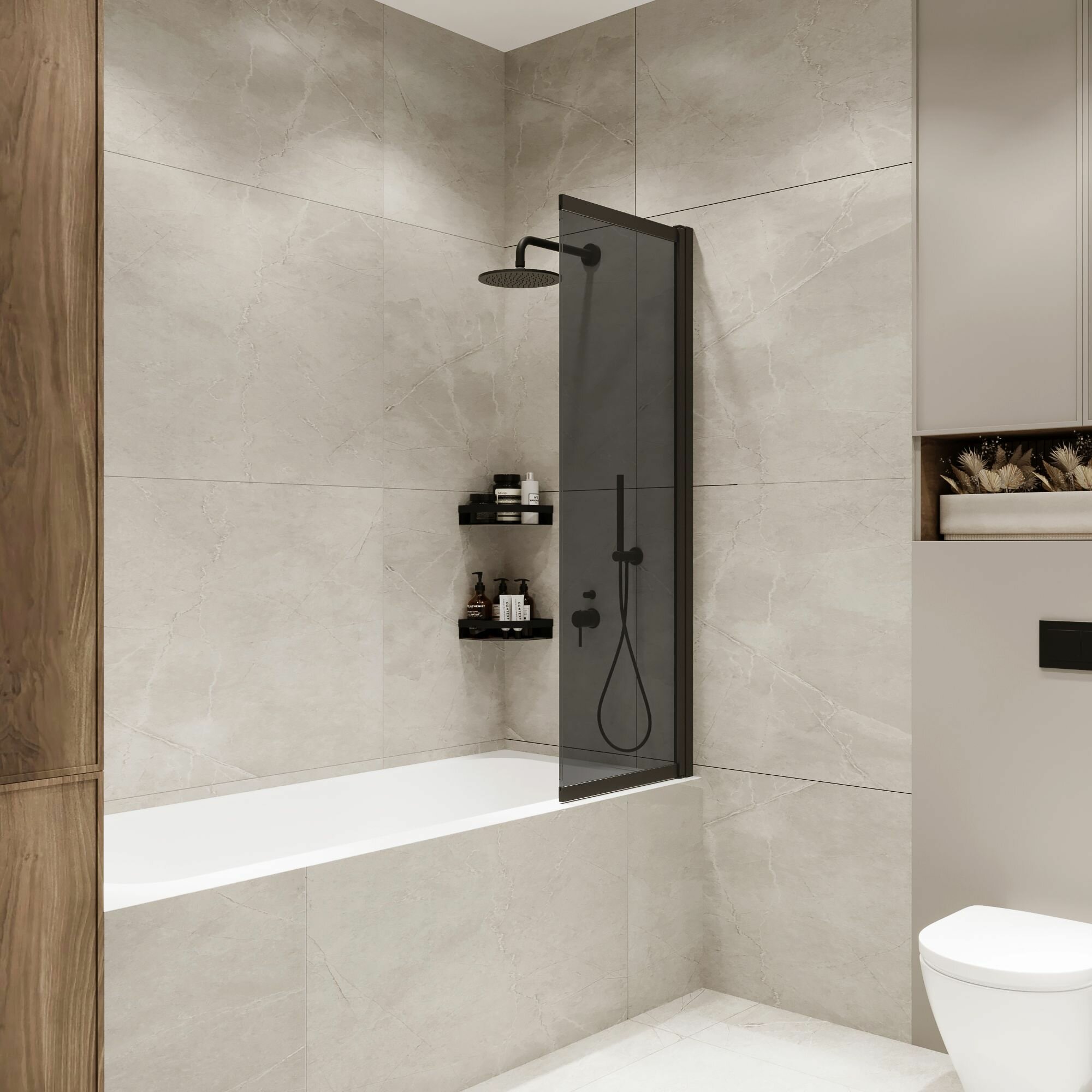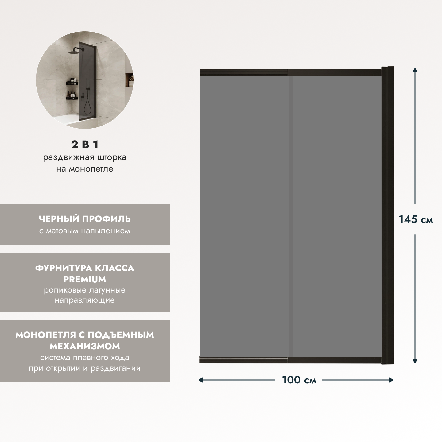 Стеклянная перегородка (шторка, ширма) на борт ванны раздвижная на монопетле черный профиль тонированное стекло интересное: