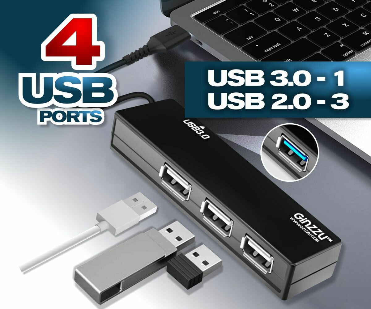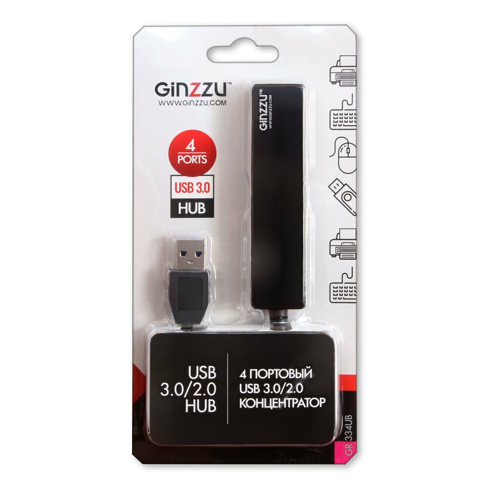Разветвитель Ginzzu USB GR-334UB, 4 порта (1xUSB 3.0 + 3xUSB 2.0) черный