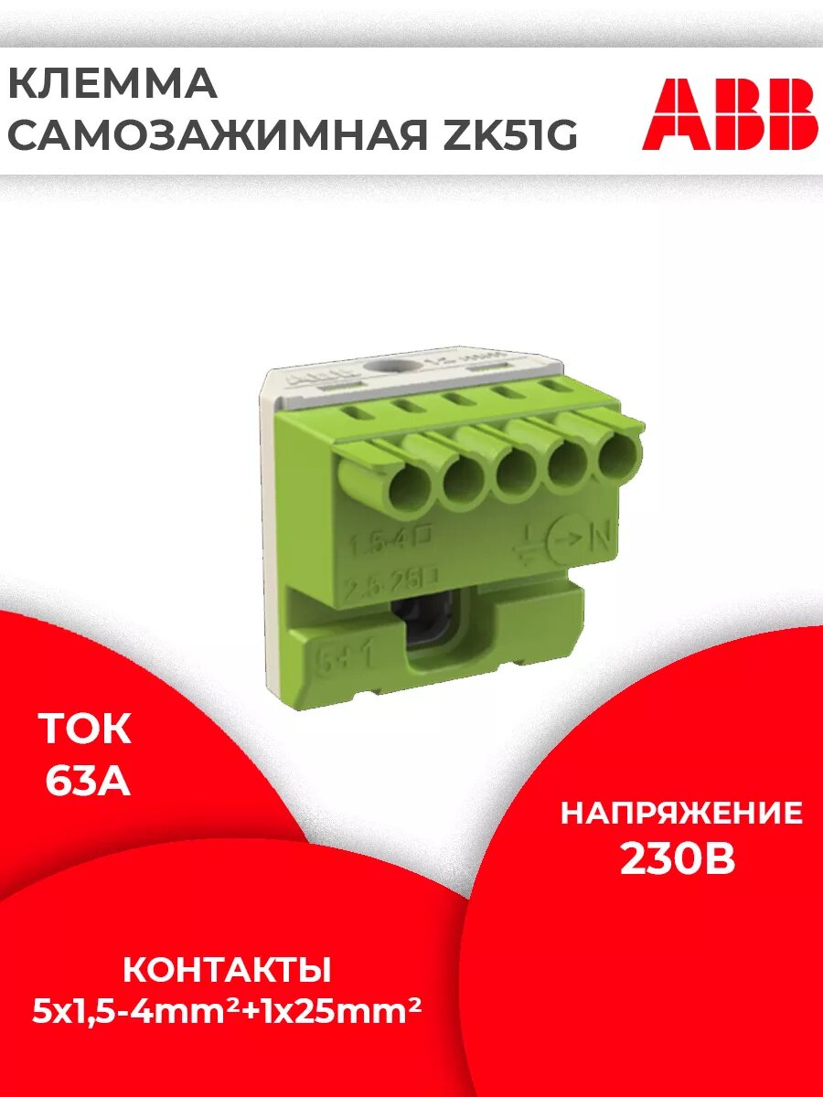 Колодка клеммная ABB ZK51G , Клеммная колодка безвинтовая PE 5x1,5-4мм2 +1x25мм2 - 1шт интересное: