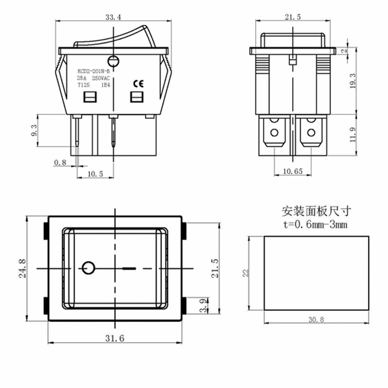 Выключатель 22,0x38,00мм ASW-17D подсветка желтая 12В 35А ON-OFF 4 контакта
