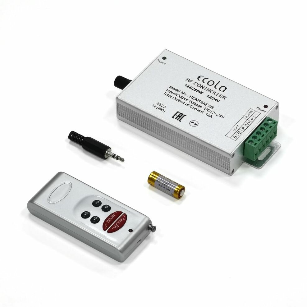 | Подробная комплектация | Ecola Аудиоконтроллер 12V 144W(24V 288W) 12A RGB, пульт управления, элемент питания 12V, штекер jack 3,5 стерео, инструкция, упаковка |