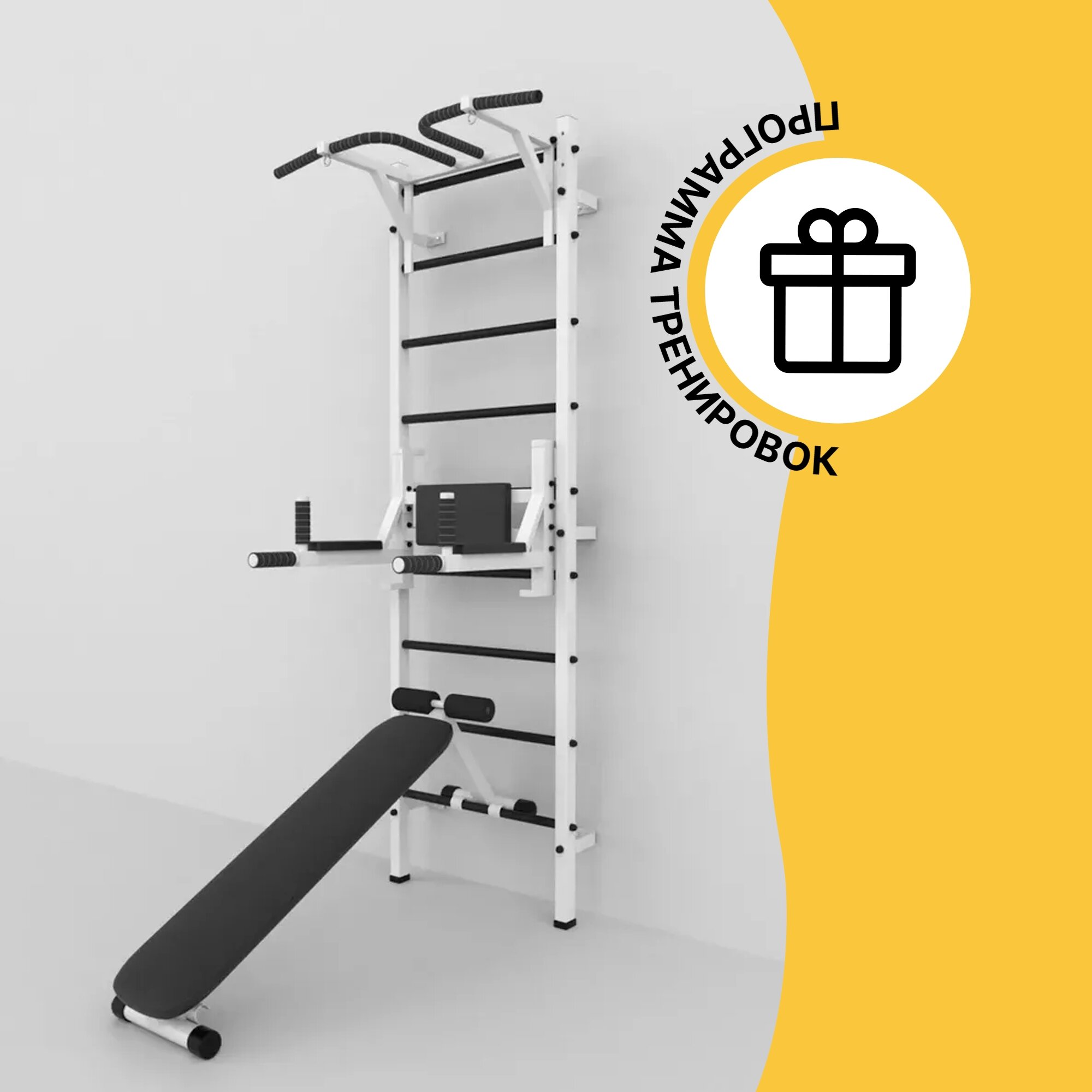 Шведская стенка + турник профессионал + брусья\пресс\стойка + скамья (Белая) интересное: