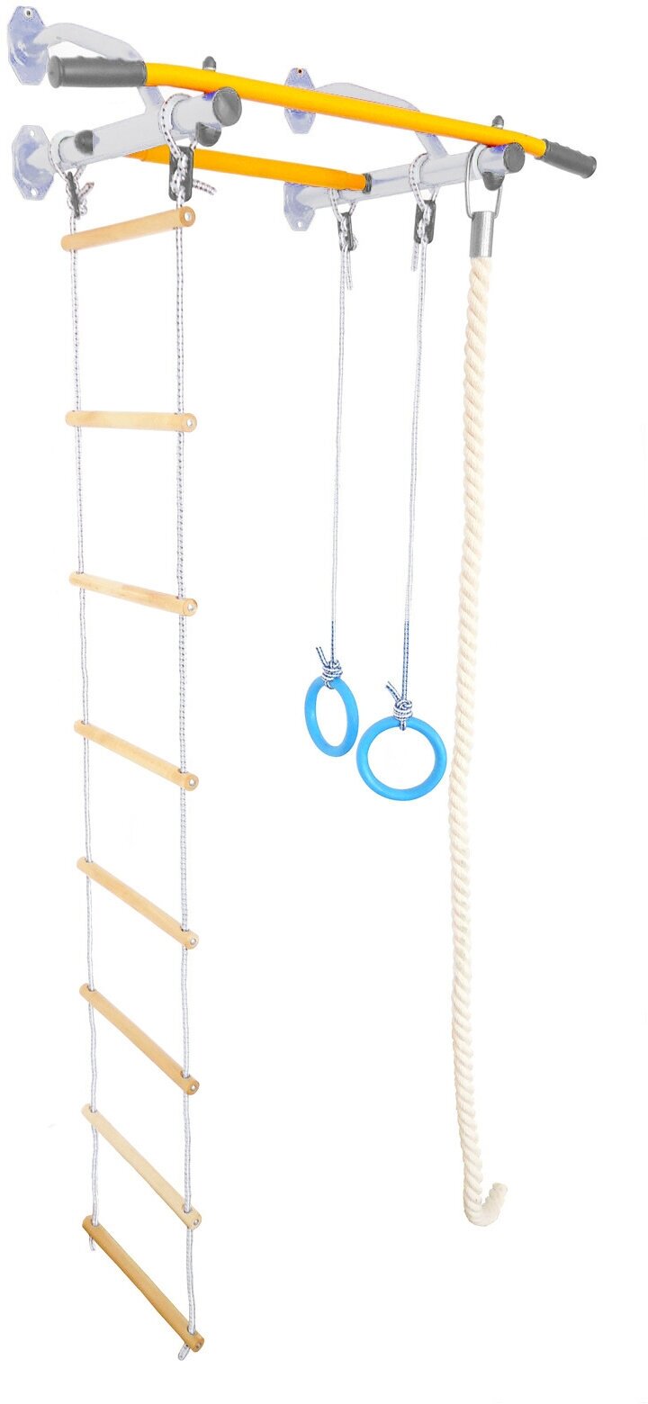 | Подробная комплектация | Основа пристенный турник, веревочная лестница, гимнастические кольца и канат |