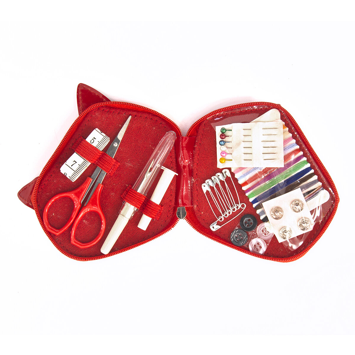 | Подробная комплектация | картонная шпуля с подмотками нитей 7 разных цветов, пластиковый фурляр с ручными иглами, сантиметровая лента, вспарыватель, ножнички для подрезки нитей, 6 булавок с жемчужными головками, 4 пришивные металлические кнопки, 2 белые и 2 черные рубашечные пуговицы |