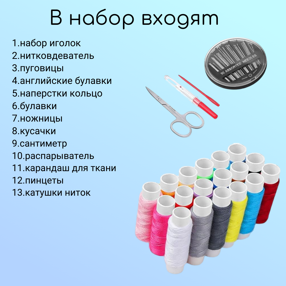 | Изделие | игольница / пенал / аксессуары для шитья / иголки / набор для шитья / нитевздеватель / нитки |