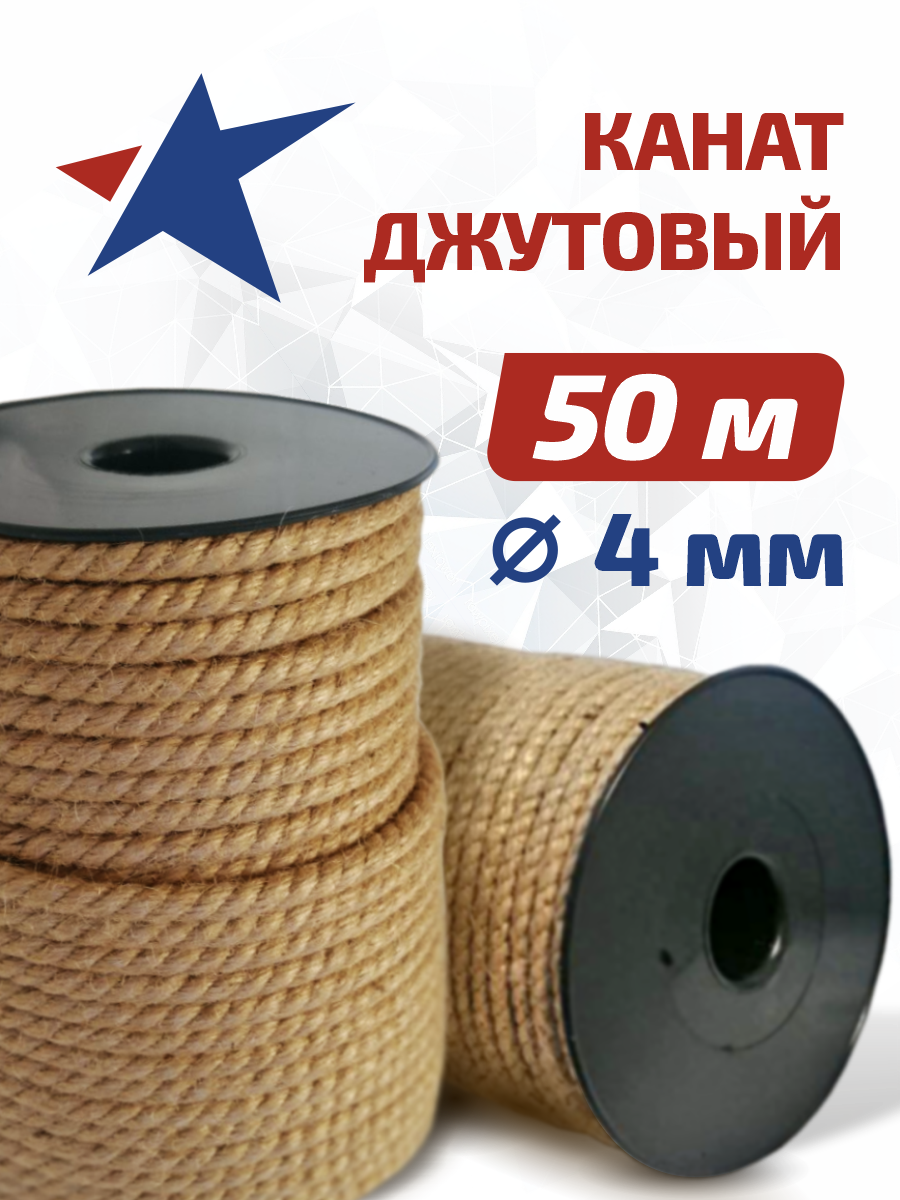 Купить Канат джутовый (верёвка) для рукоделия и вязания, для когтеточек. Диаметр 4 мм, длина 50 метров. ГОСТ 1868.