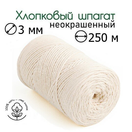 Шпагат хлопковый 3 мм 250 м неокрашенный для макраме, вязания, рукоделия интересное: