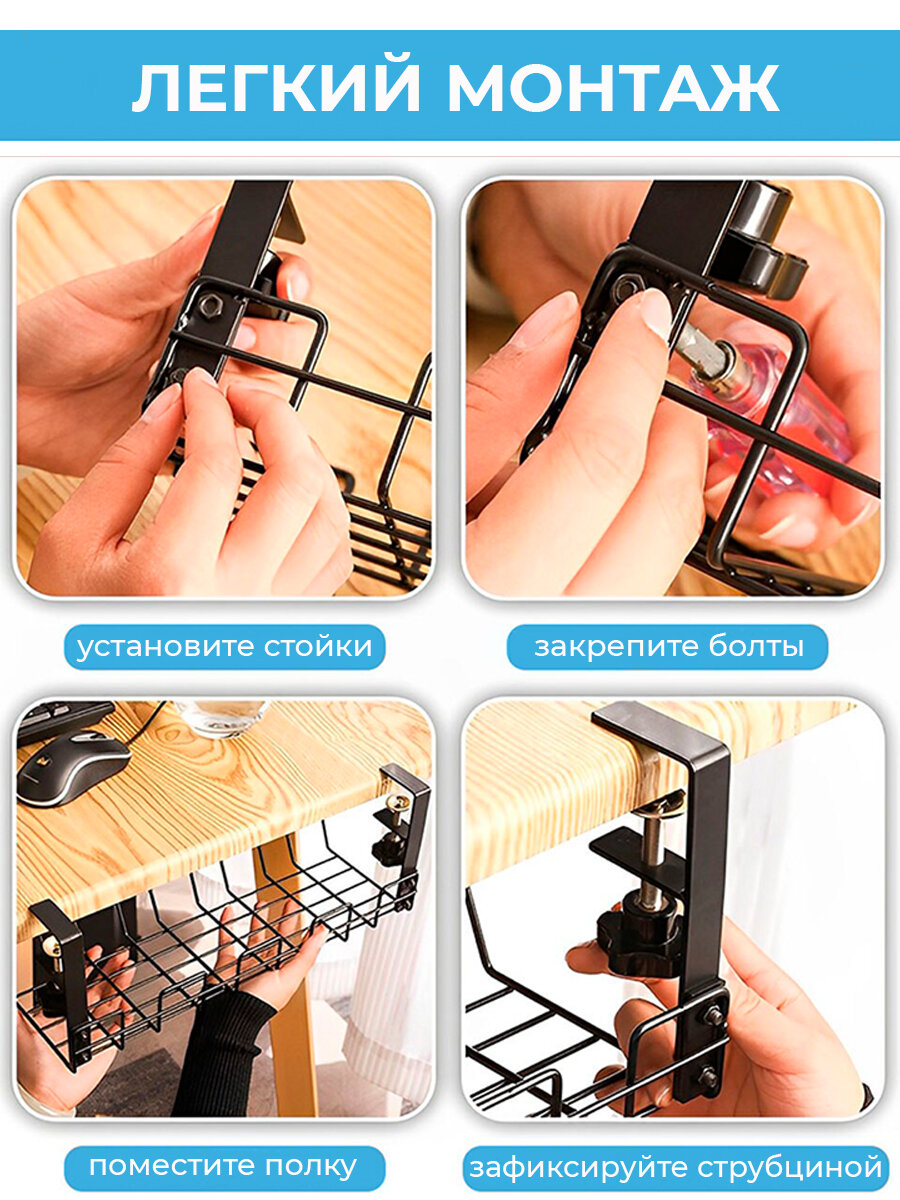 Полка органайзер для проводов и офисных аксессуаров / держатель для кабелей / сетка черный