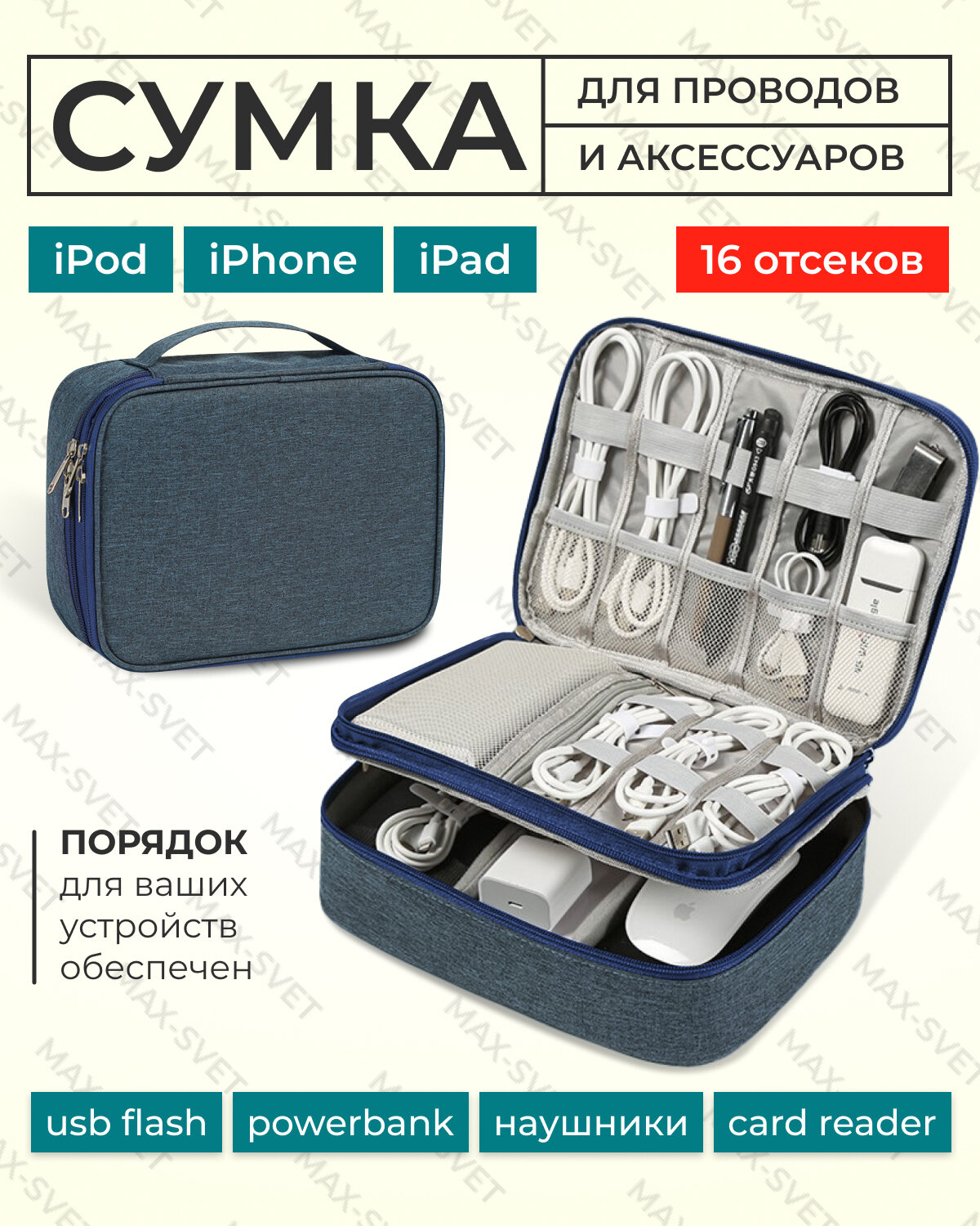 Сумка органайзер для проводов, зарядок, аксессуаров, цвет синий (MAXSVETSHOP)