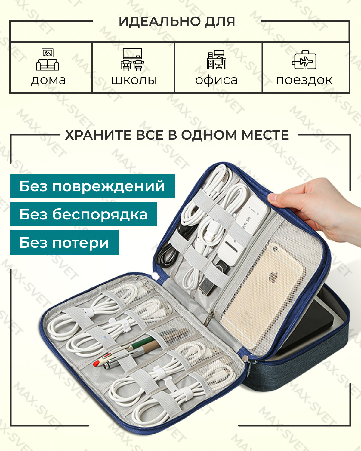 Сумка органайзер для проводов, зарядок, аксессуаров, цвет темно-синий (MAXSVETSHOP)