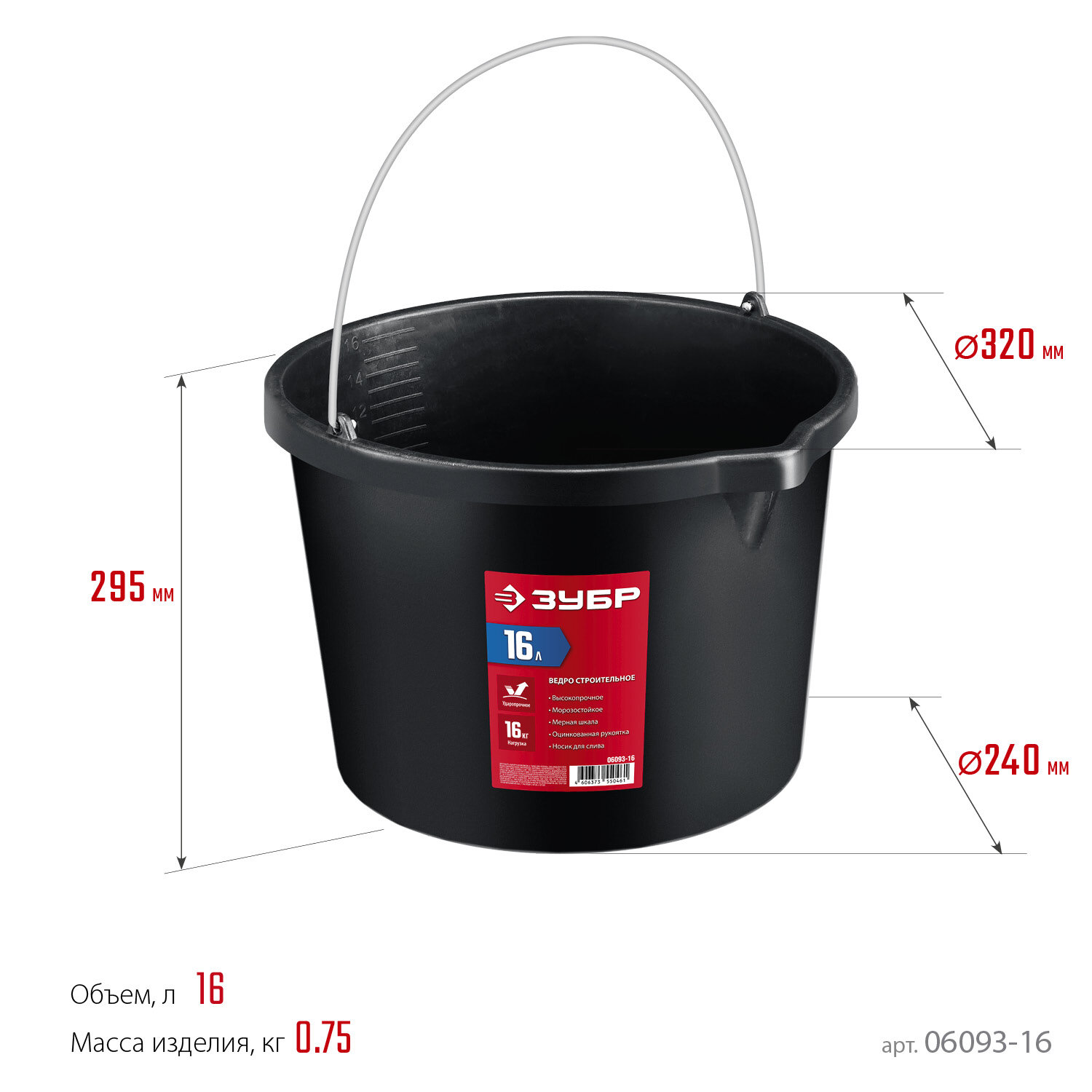 ЗУБР 16 л, ударопрочный пластик, с носиком, строительное ведро (06093-16) 10 шт. интересное: