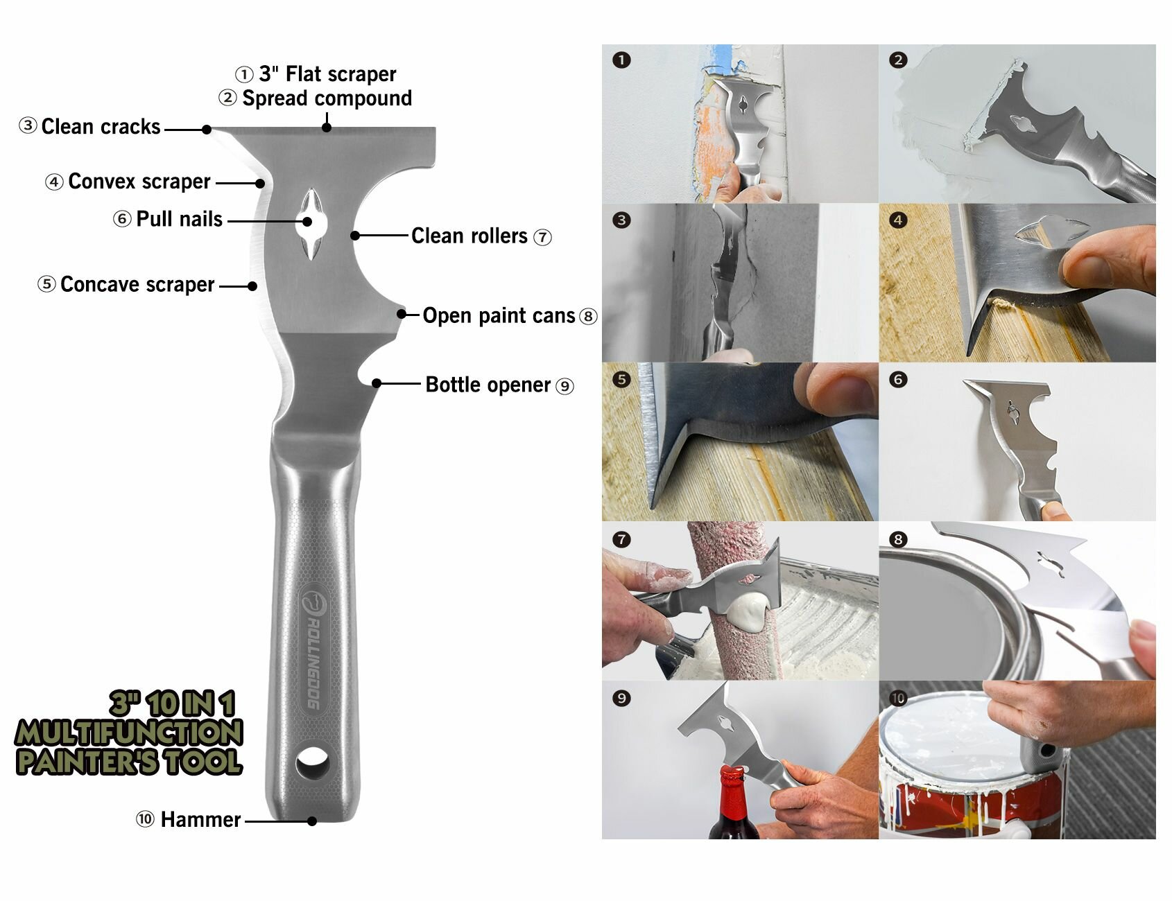 Купить Шпатель-скребок многофункциональный ROLLINGDOG Beauceron 10 в 1, цельная конструкция из нержавеющей стали