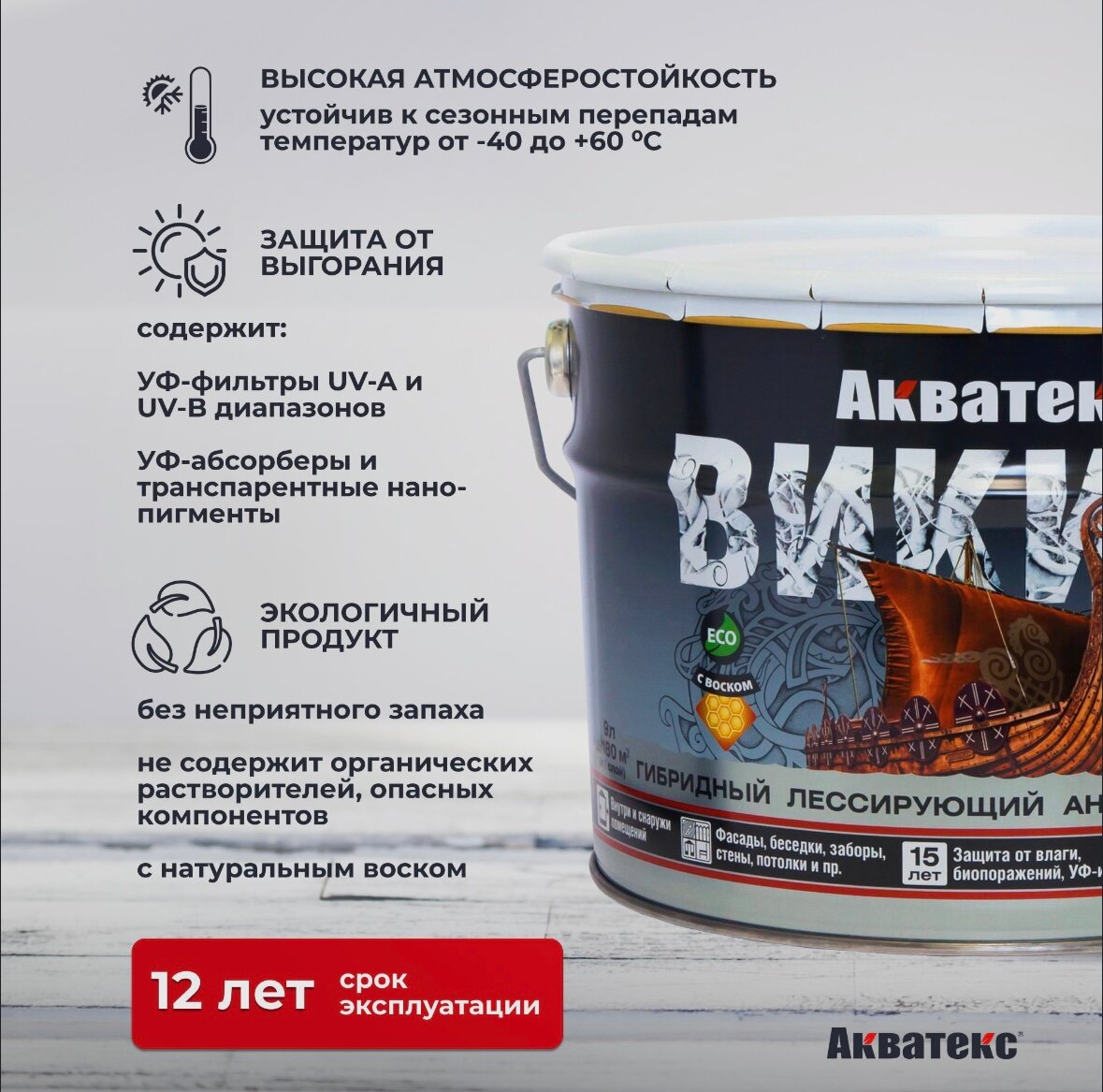 Гибридный лессирующий антисептик для дерева акватекс викинг (бесцветный / 9л.)