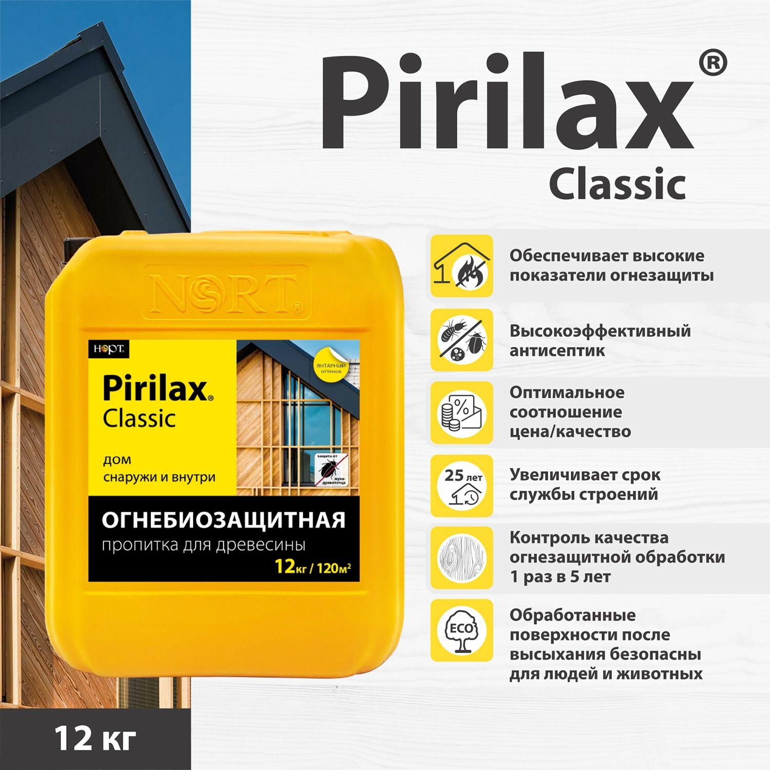 Pirilax Classic 12кг, Пирилакс, огнезащита и антисептик для древесины в нормальных условиях до 20 лет, огнезащитная пропитка