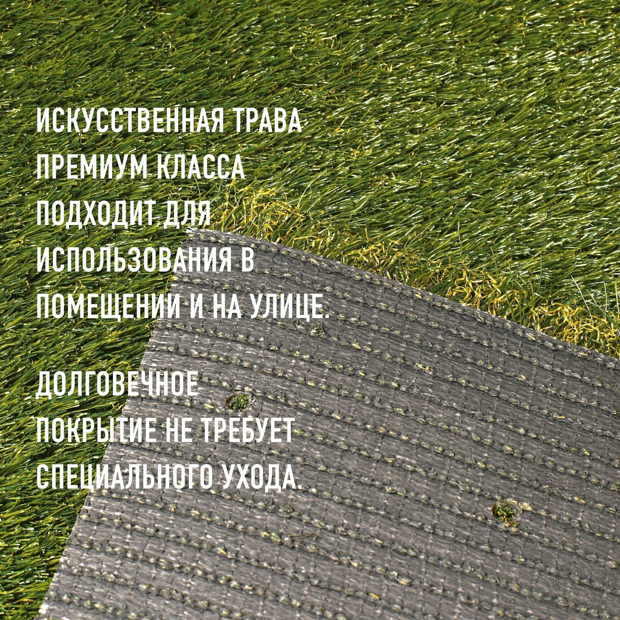 | Дополнительная информация | Газон из экологически чистого 100% полиэтилена. Материал не требователен в уходе, легко укладывается и так же легко демонтируется, обладает защитой от ультрафиолетовых лучей. |
