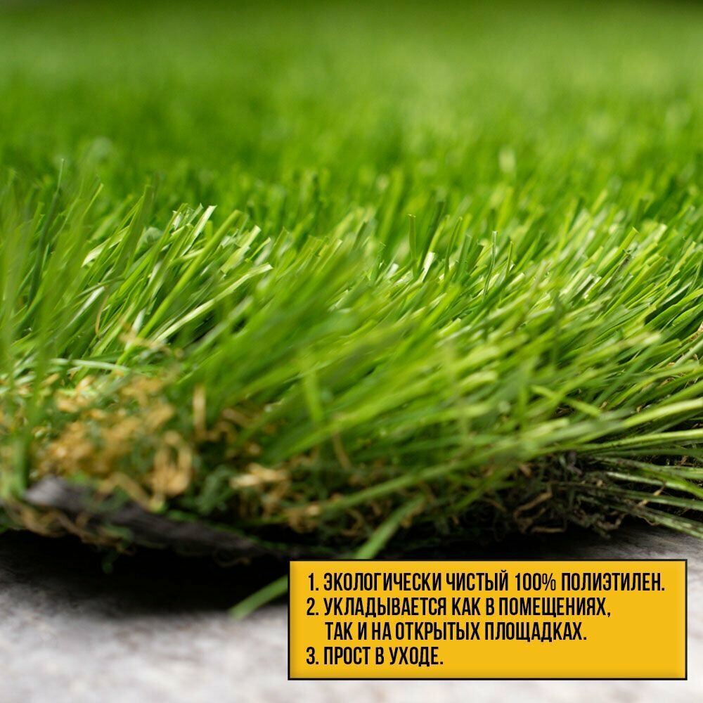 | Дополнительная информация | Газон из экологически чистого 100% полиэтилена. Материал не требователен в уходе, легко укладывается и так же легко демонтируется, обладает защитой от ультрафиолетовых лучей. |