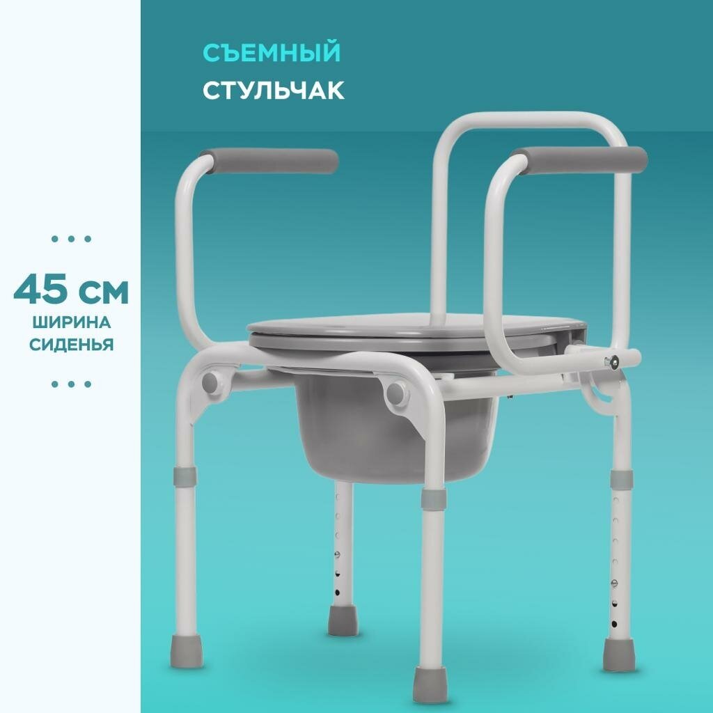 | Комплектация | Кресло; съемное сиденье с откидной крышкой; стульчак с крышкой и судном из прочного пластика; противоскользящие накладки на ножки |