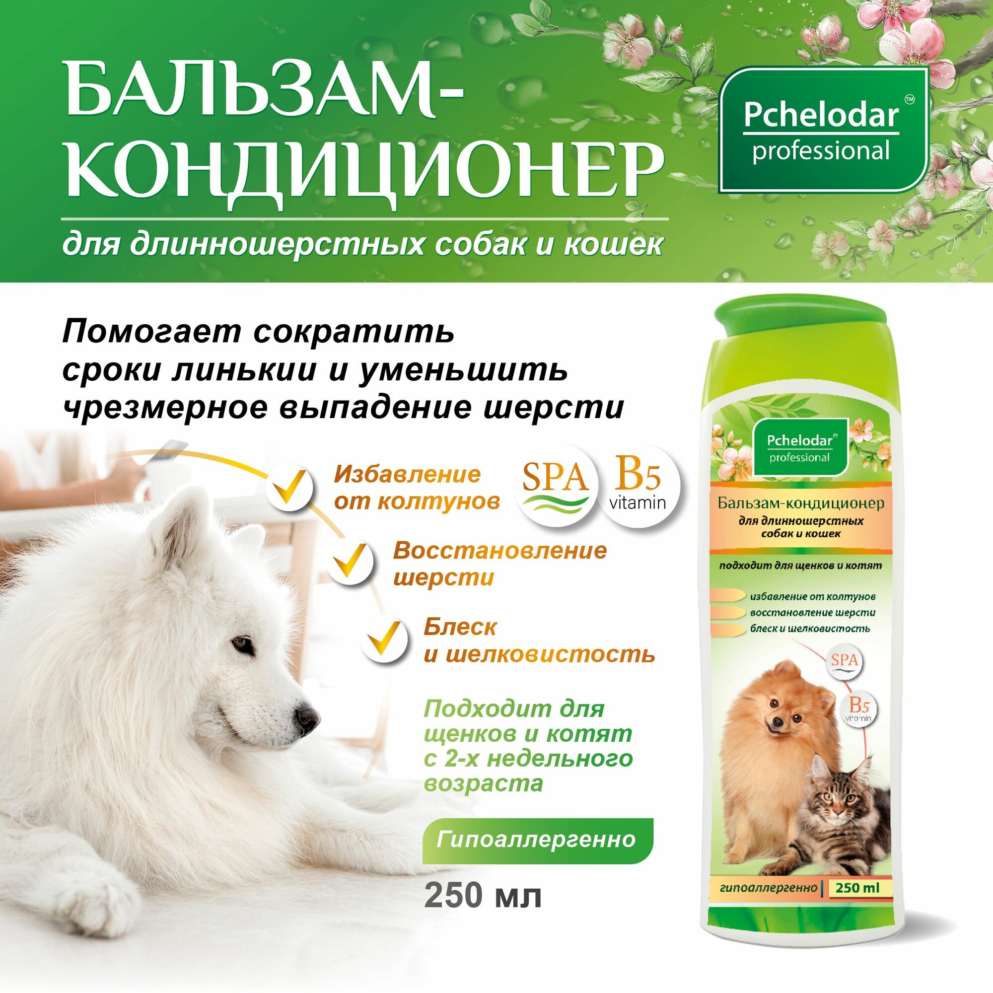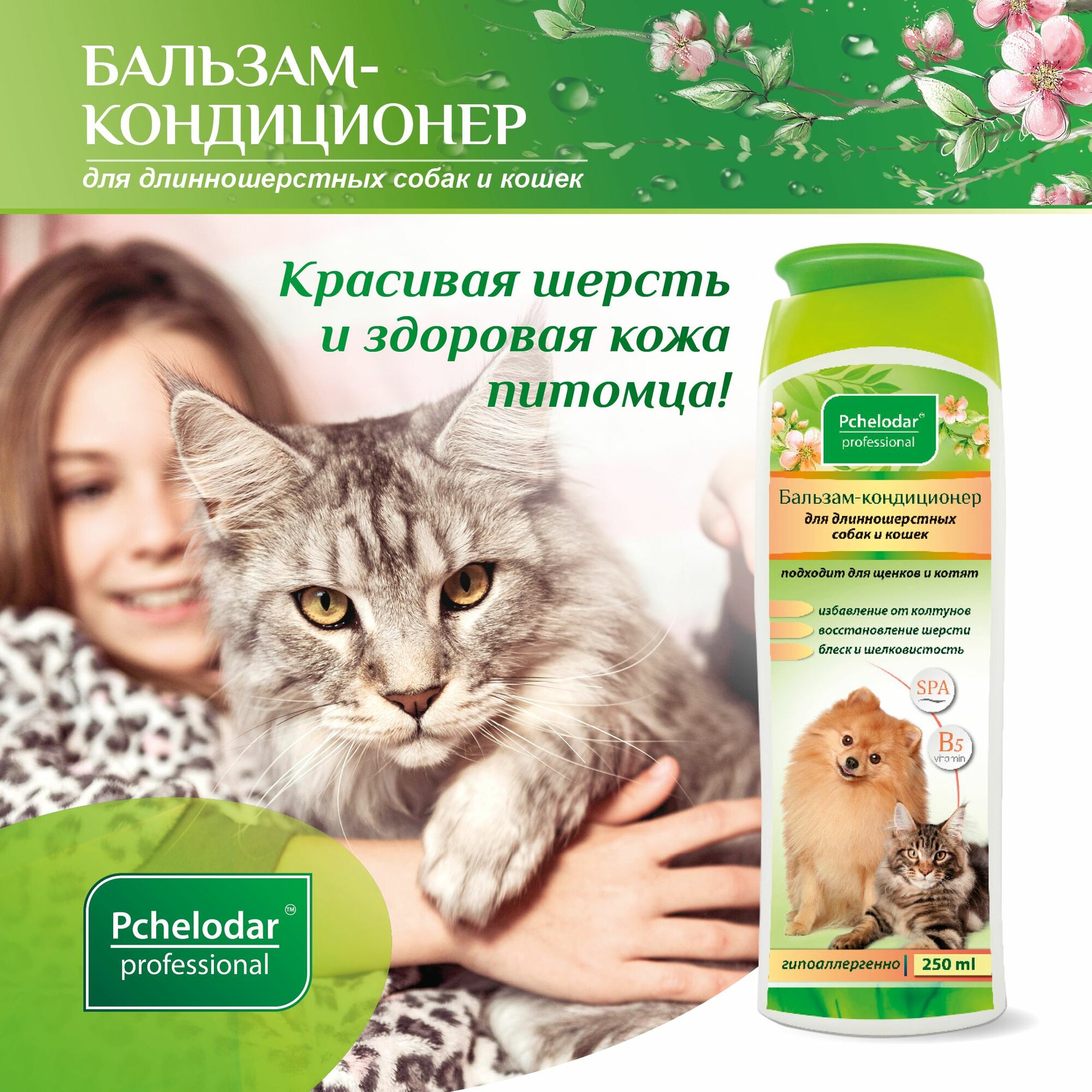 Бальзам-кондиционер для длинношерстных кошек и собак PCHELODAR (250 мл)