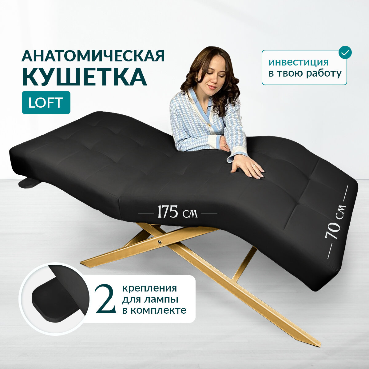 Анатомическая кушетка в стиле Лофт, в салон красоты, золотая ножка, в студию, для наращивания ресниц, для преманентного макияжа, Велюр Цвет Черный