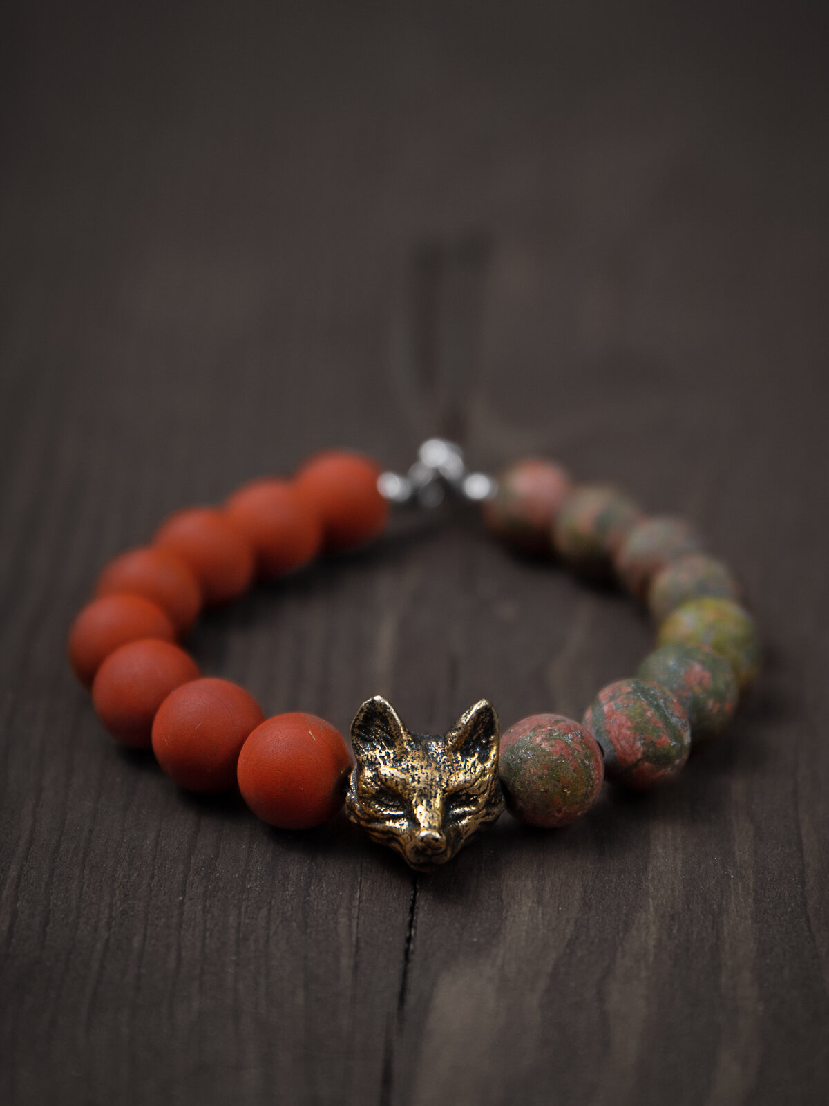 Фо - браслет мужской / женский из натуральных камней (яшма и унакит) с бусиной из бронзы в виде лисы, размер 21-24
