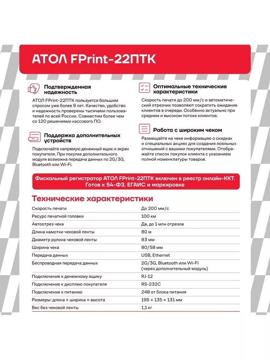 Ниже Вы можете прочитать отзывы на Касса АТОЛ FPrint-22ПТК + ФН 1.2 на 36 месяцев, ознакомится с подробными характеристиками, посмотреть интересные обзоры и фотографии на Касса АТОЛ FPrint-22ПТК + ФН 1.2 на 36 месяцев.
