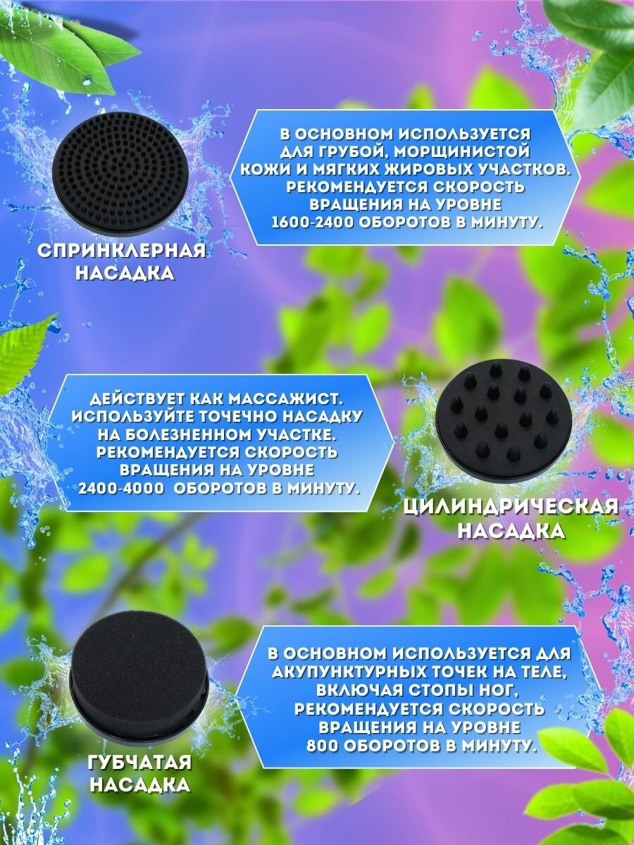 | Подробная комплектация | Блок управления, 1 манипула, 5 аппликаторов (3 из плотной резины для основной проработки тела, снятия мышечного напряжения, для коррекции локальных жировых отложений, работы с целлюлитом и проблемными зонами: спина, бедра, ягодицы; 1 из мягкого поролона: для шейно-воротниковой зоны, ног, рук и боковых зон спины; 1 из мягкого поролона для более деликатного воздействия на поверхность кожи, для работы с эпидермисом, дермальным слоем, для отшелушивания клеток эпителия и омертвевшей кожи); держатель для манипулы, ванночка / поднос для насадок, кабель питания. |