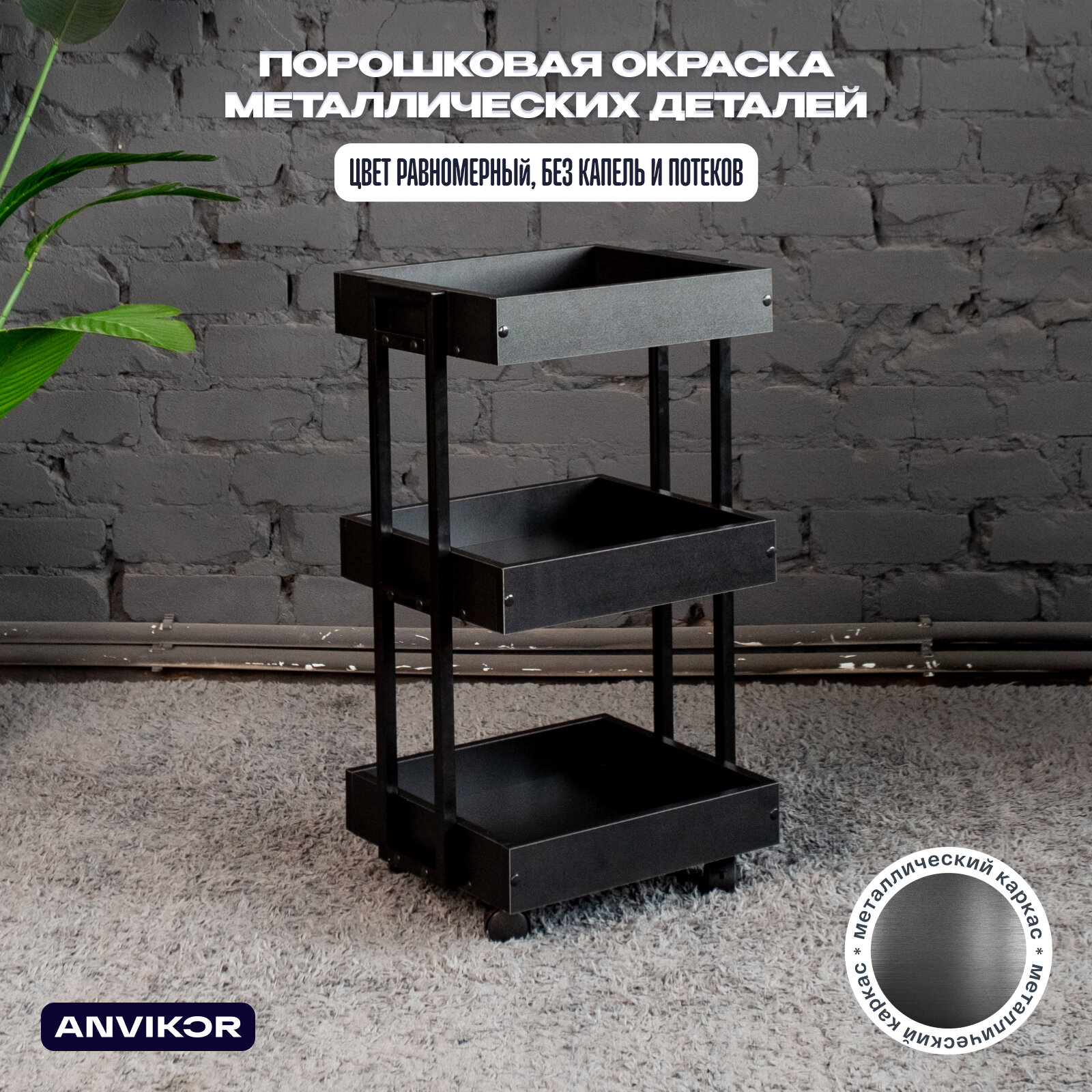 Тележка косметологическая трехъярусная с бортиками на колесиках лофт Ангара черная