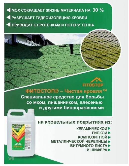 FITOSTOP Чистая кровля 5л, средство для удаления мха и лишайника с кровли. интересное: