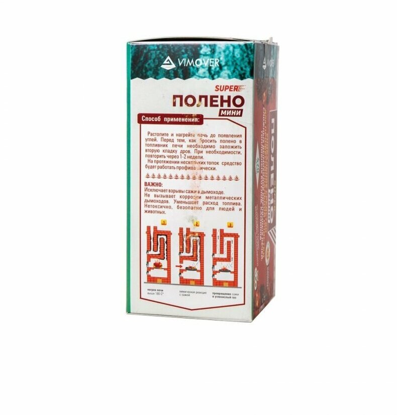 | Способ применения | растопите и нагрейте печь или котел до появления углей. Бросьте чистящий брикет в топливник печи. Продолжайте топить в обычном режиме. Особенности применения в котлах: Перед использованием очистителя прогрейте котел и дымоход. Для этого вручную переведите котел в режим «Горение» на 30-40 минут. Металлические части и загрязнения на них прогреются за это время. Добавив брикет и еще дров, поддерживаем режим «Горение» в течение еще 25 минут до полного сгорания брикета. Активный очищающий газ почистит топку котла, теплообменник, камеру дожига газа и дымоход |