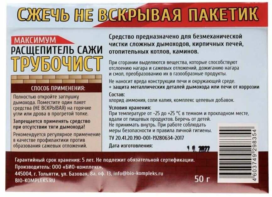 | Способ применения | полностью откройте заглушку дымохода. Поместите один пакет средства (НЕ ВСКРЫВАЯ) на горячие угли или дрова в прогретой топке. Средство следует регулярно применять в качестве профилактики против образования сажевых отложений. Запрещается применять средство при отсутствии тяги дымохода |