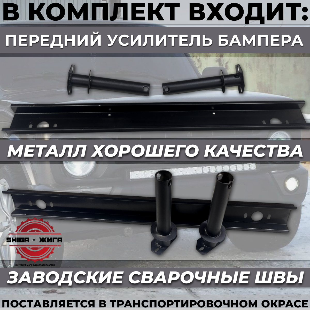 | Подробная комплектация | В данную комплектацию входит : 1. Передний бампер (под ПТФ) с усилителем и крепежом 2. Задний бампер с усилителем и крепежом Данные детали - бампера поставляются под окрас, пластик без шагрени. |