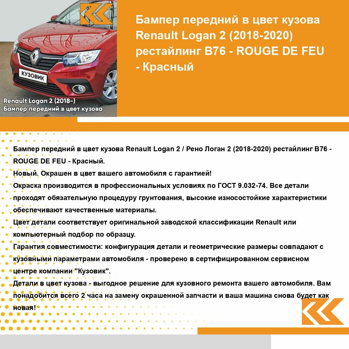 СохранитьБампер передний в цвет кузова для Рено Логан 2 Renault Logan 2 (2018-2022) / Рено Сандеро 2 Renault Sandero 2 (2018-2022) рестайлинг B76 - ROUGE DE FEU - Красный интересное: