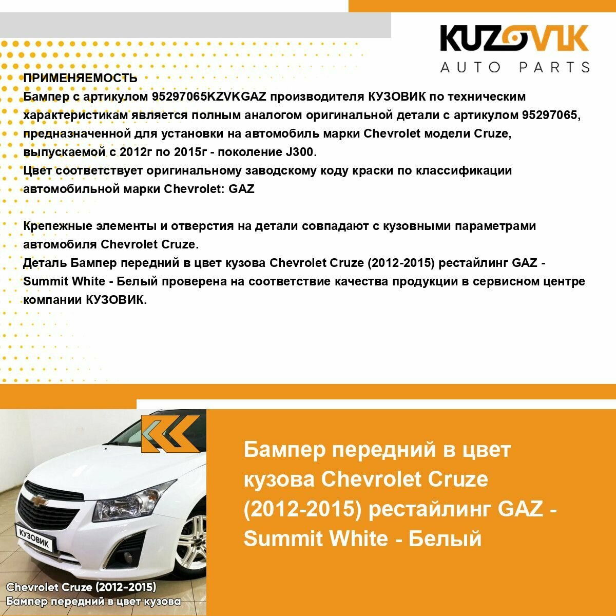 | Подробная комплектация | Бампер передний в цвет кузова Chevrolet Cruze рестайлинг |