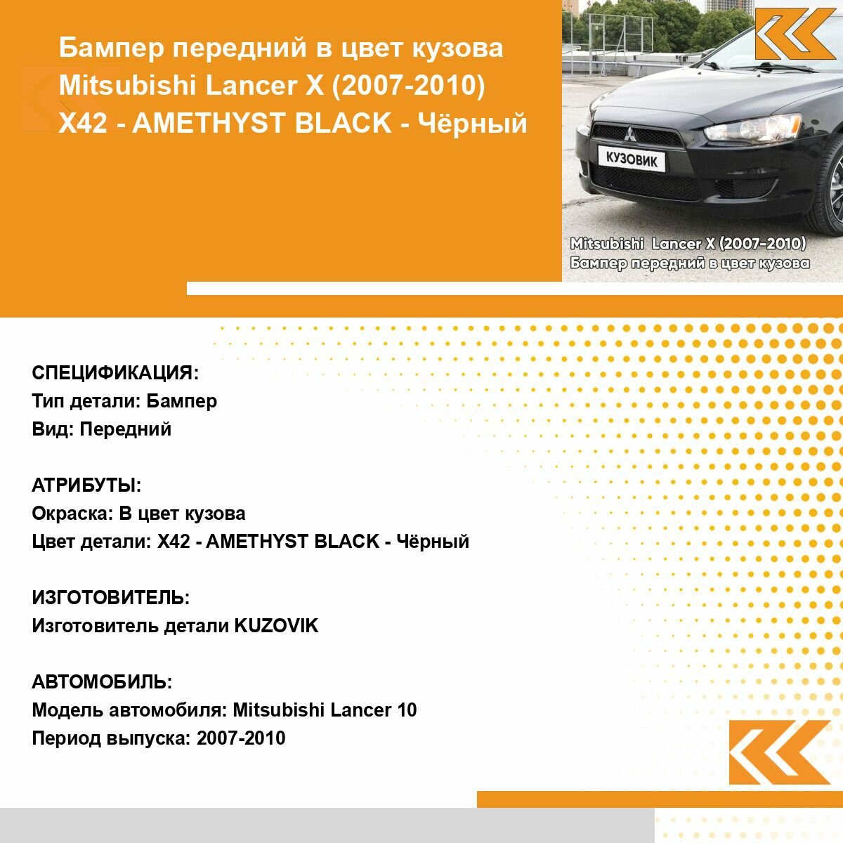 | Подробная комплектация | Бампер передний в цвет кузова для Митсубиси Лансер 10 (2007-2010) без решеток |