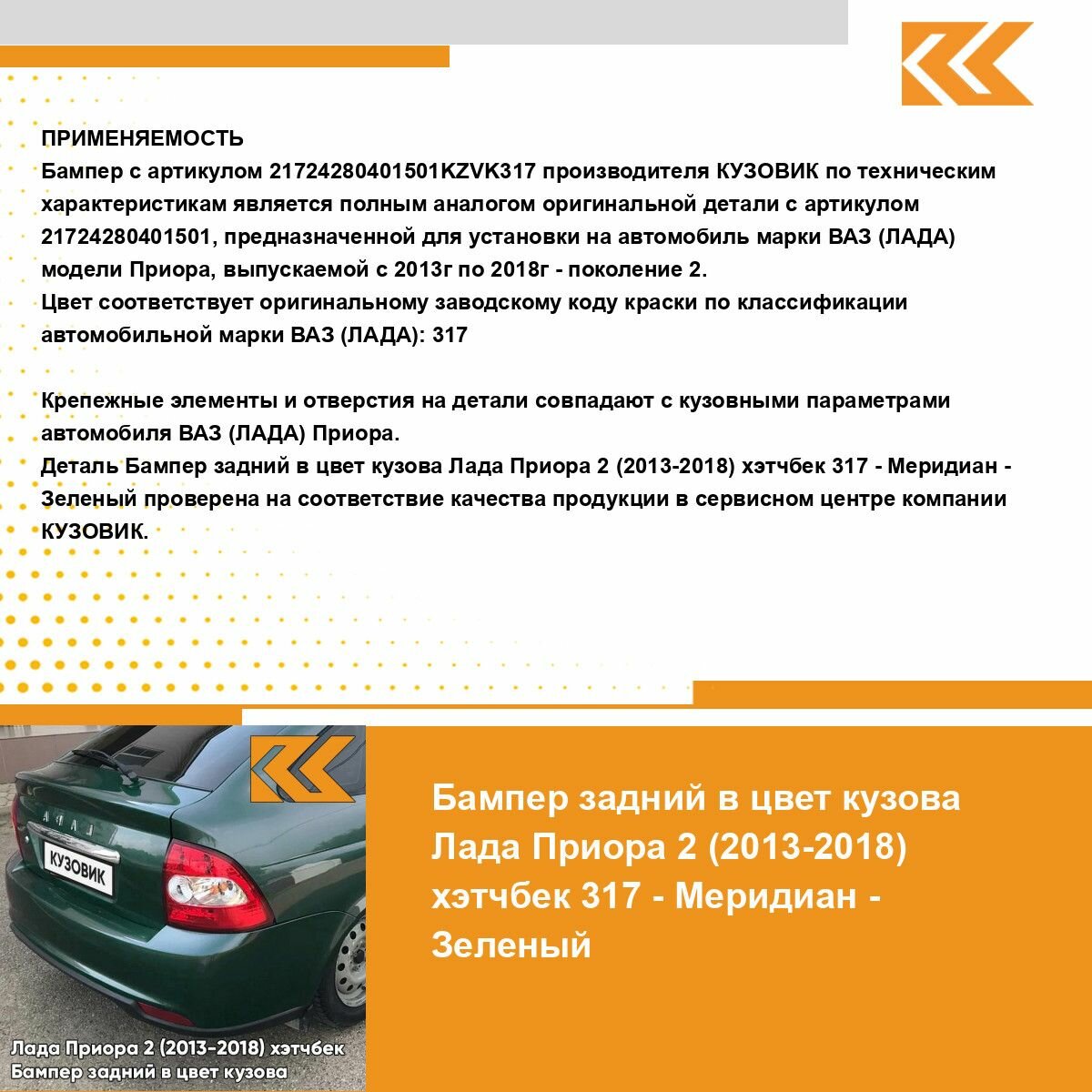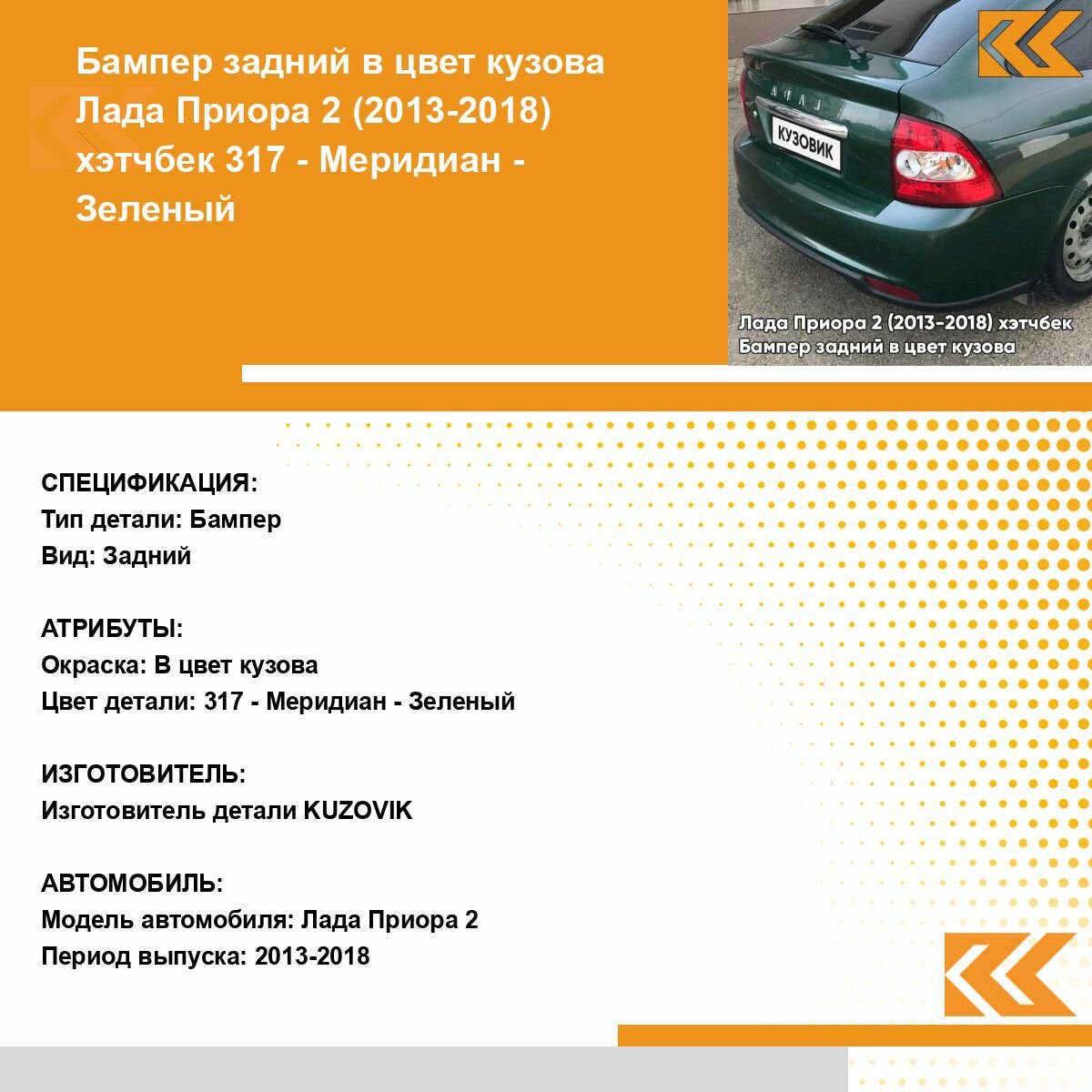 | Подробная комплектация | Бампер задний в цвет кузова для Лада Приора 2 (2013-2018) хэтчбек |