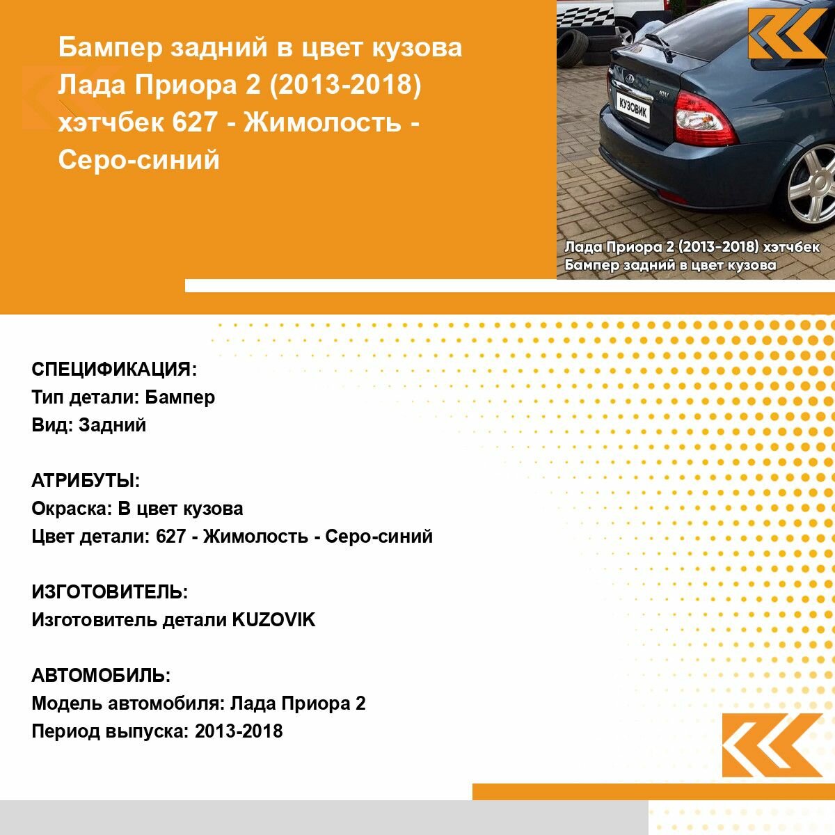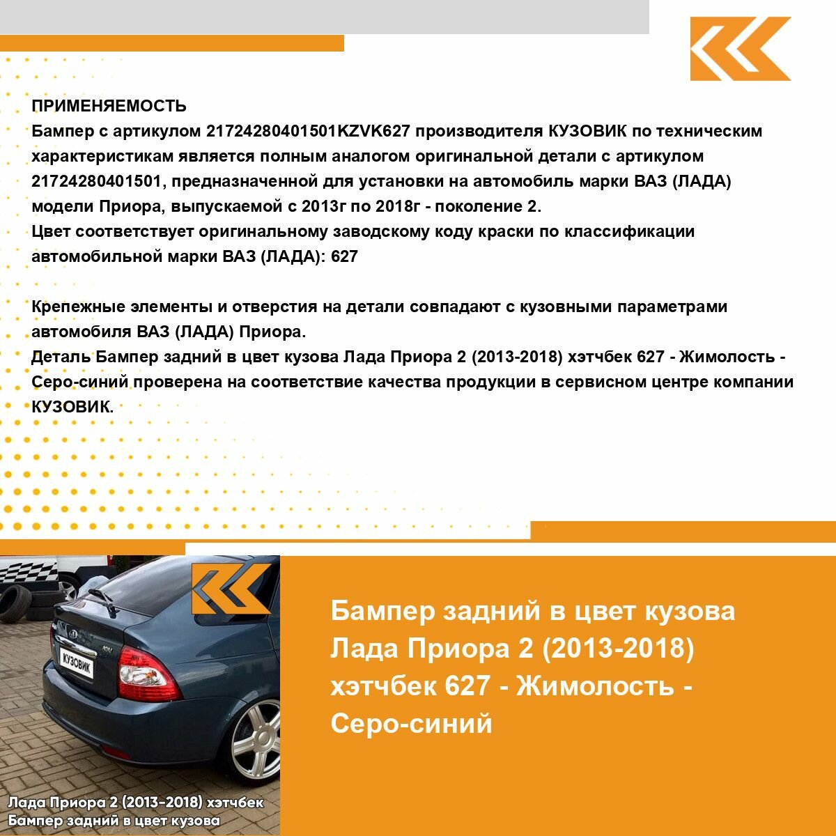 | Подробная комплектация | Бампер задний в цвет кузова для Лада Приора 2 (2013-2018) хэтчбек |