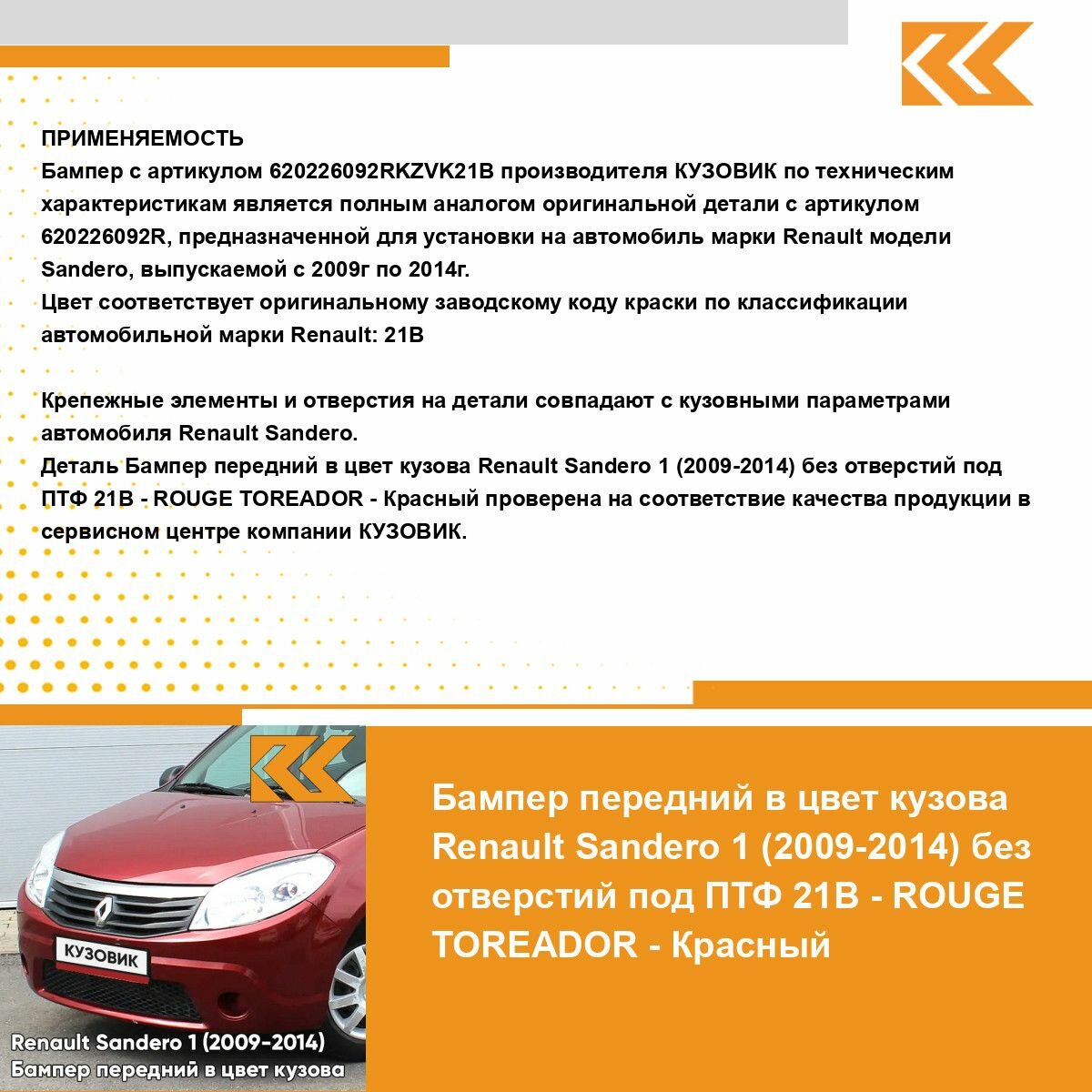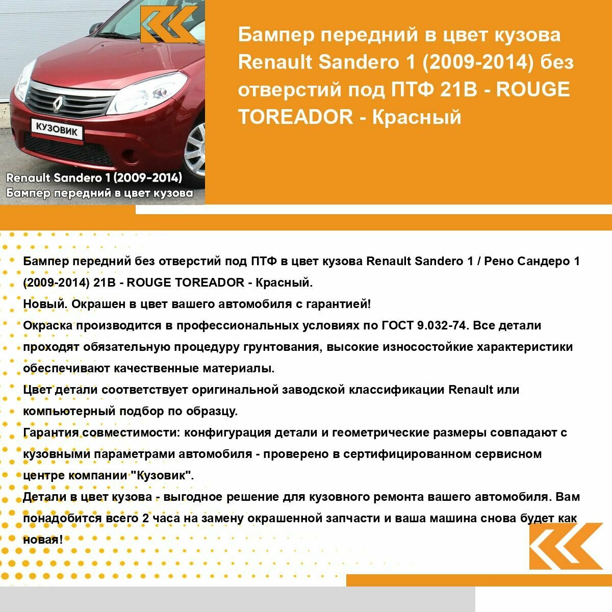 | Подробная комплектация | Бампер передний в цвет кузова Renault Sandero 1 Рено Сандеро (2009-2014) без отверстий под птф 21B - ROUGE TOREADOR - Красный |