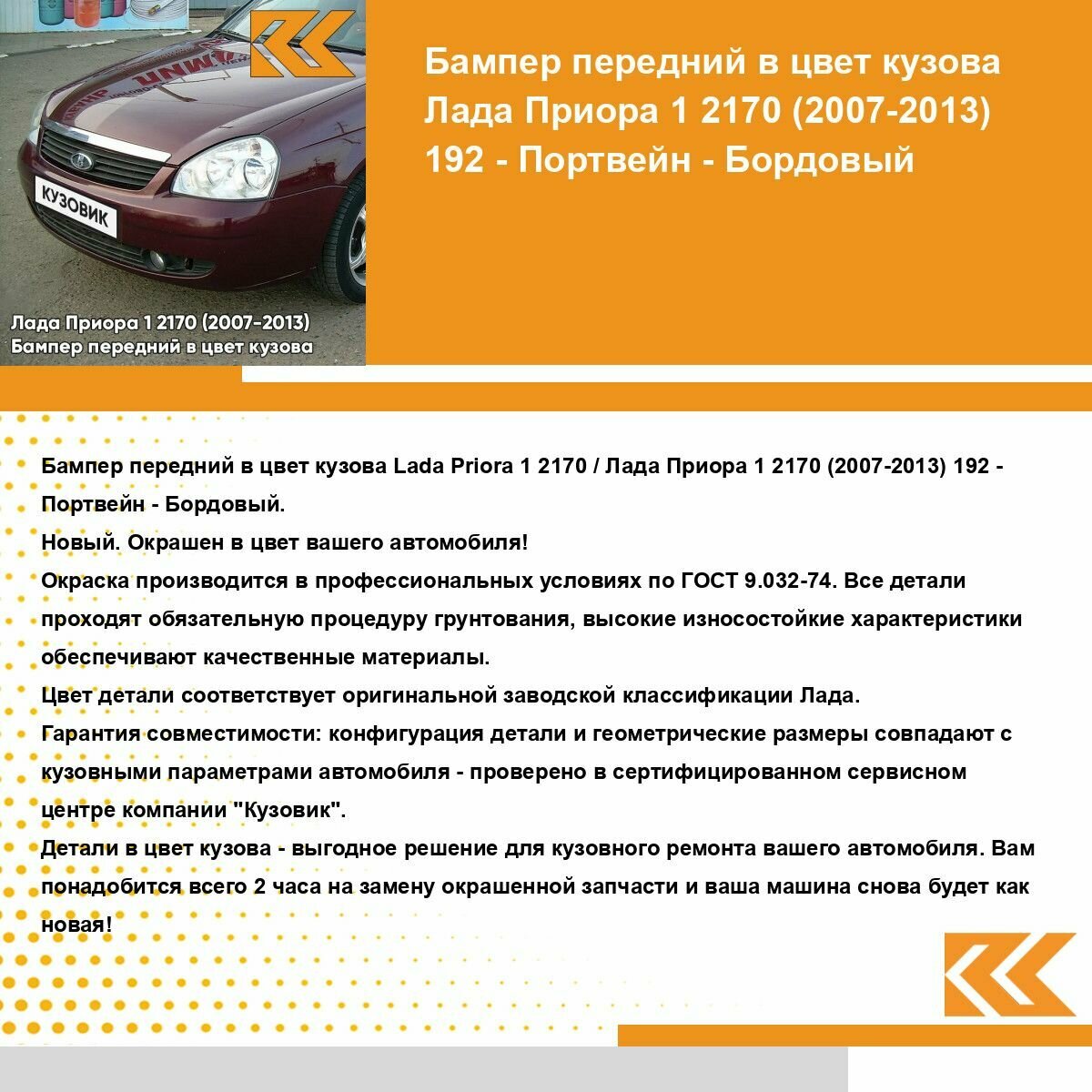 | Подробная комплектация | Бампер передний в цвет кузова для Лада Приора без решеток |