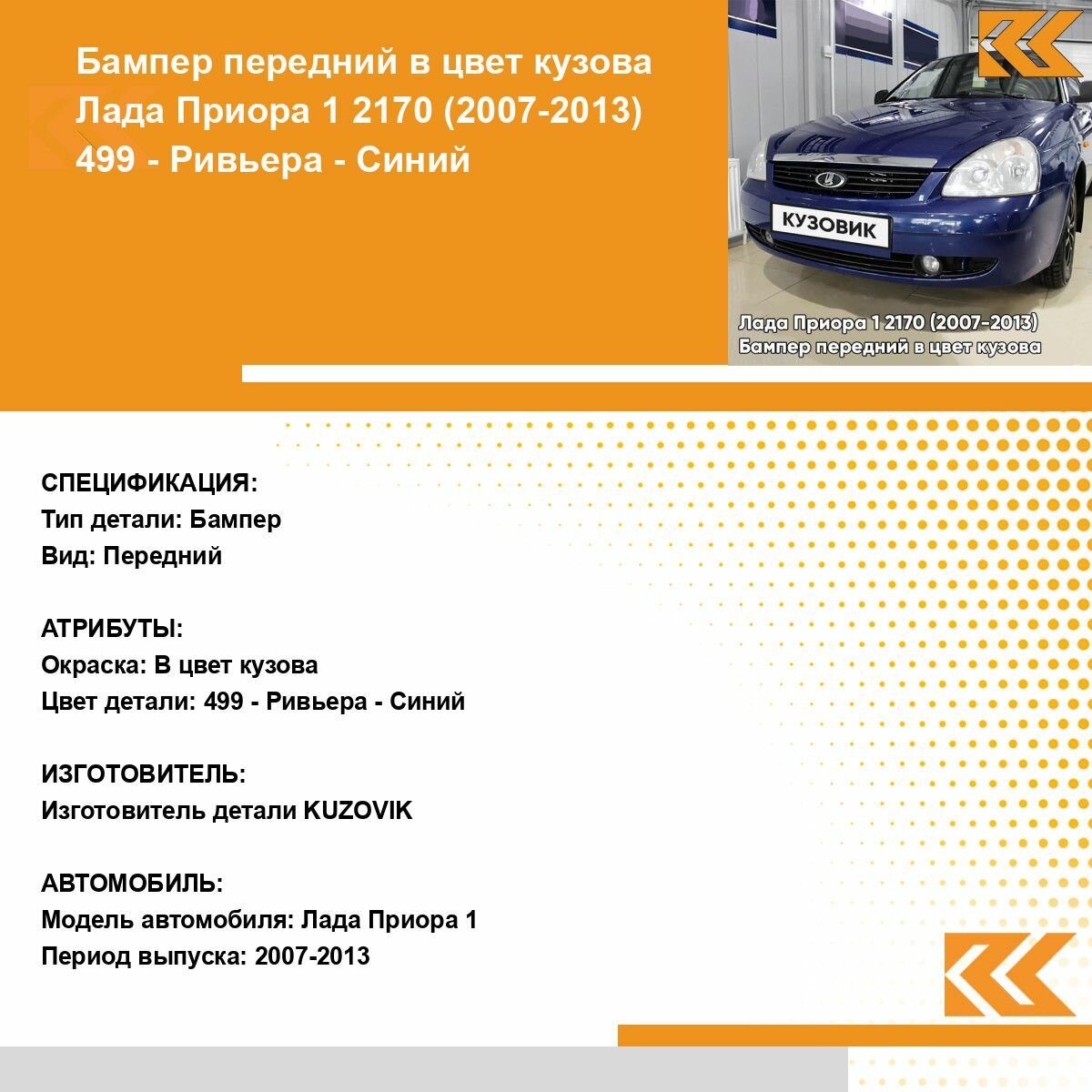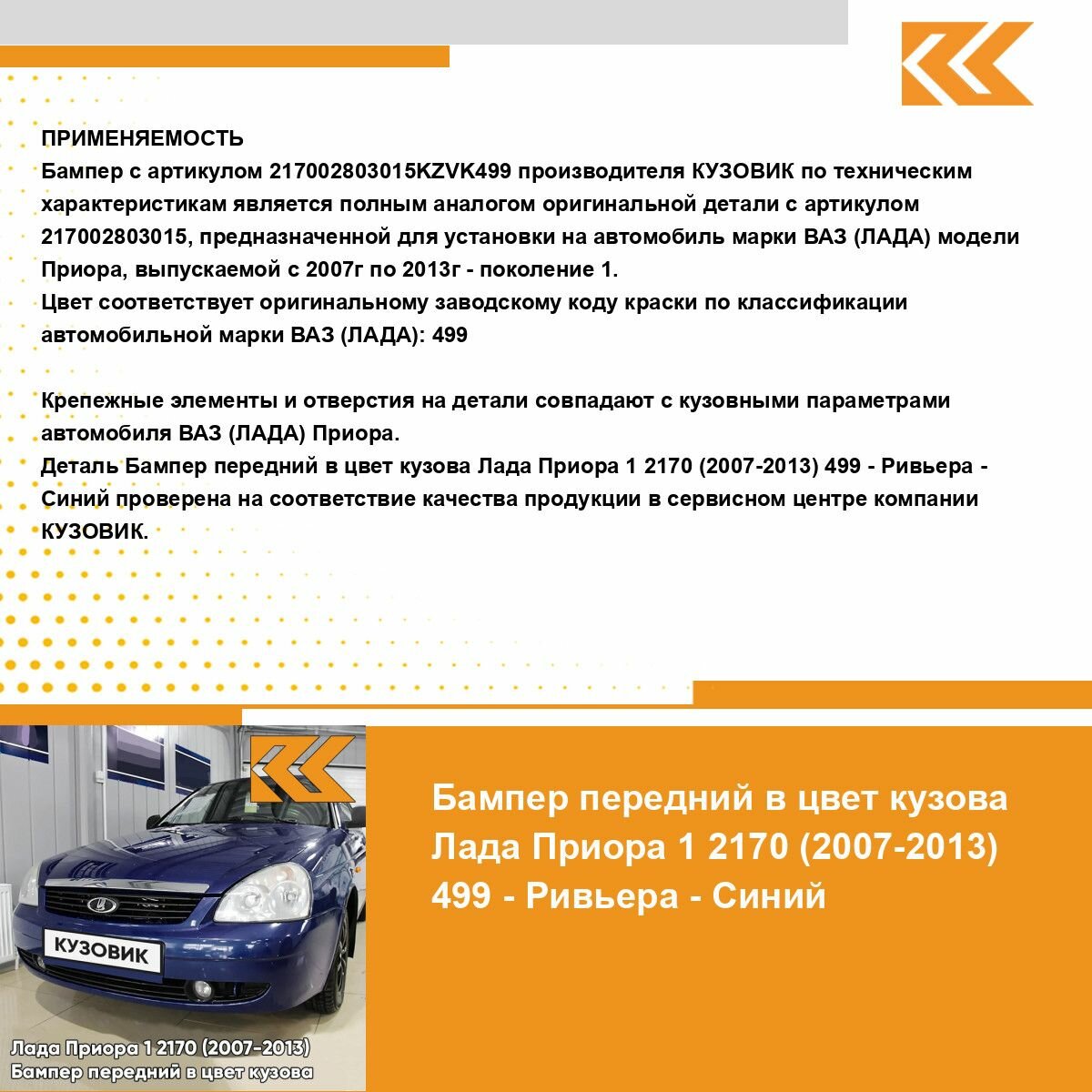 | Подробная комплектация | Бампер передний в цвет кузова для Лада Приора без решеток |