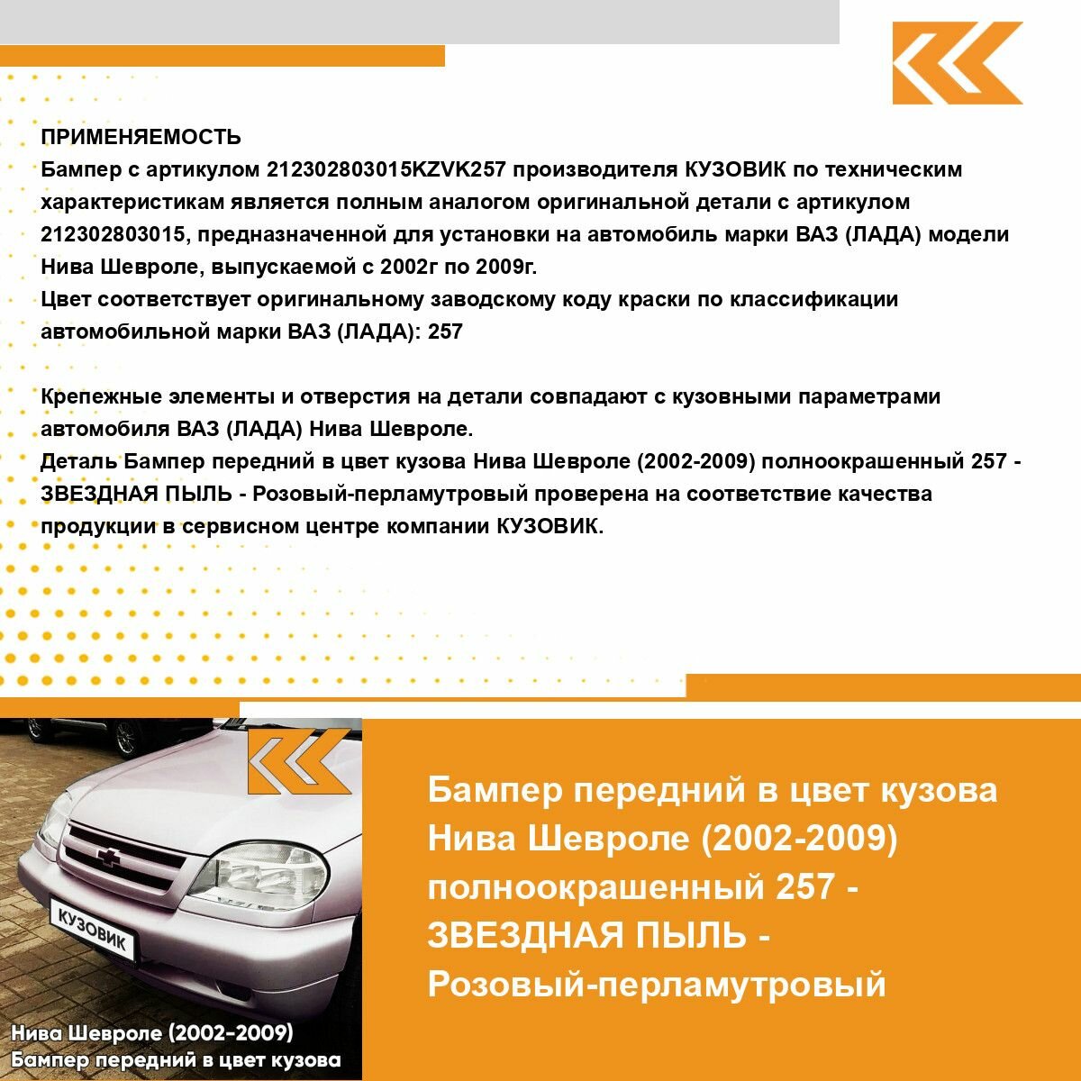 | Подробная комплектация | Бампер передний в цвет кузова для Нива Шевроле (2002-2009) полноокрашенный |