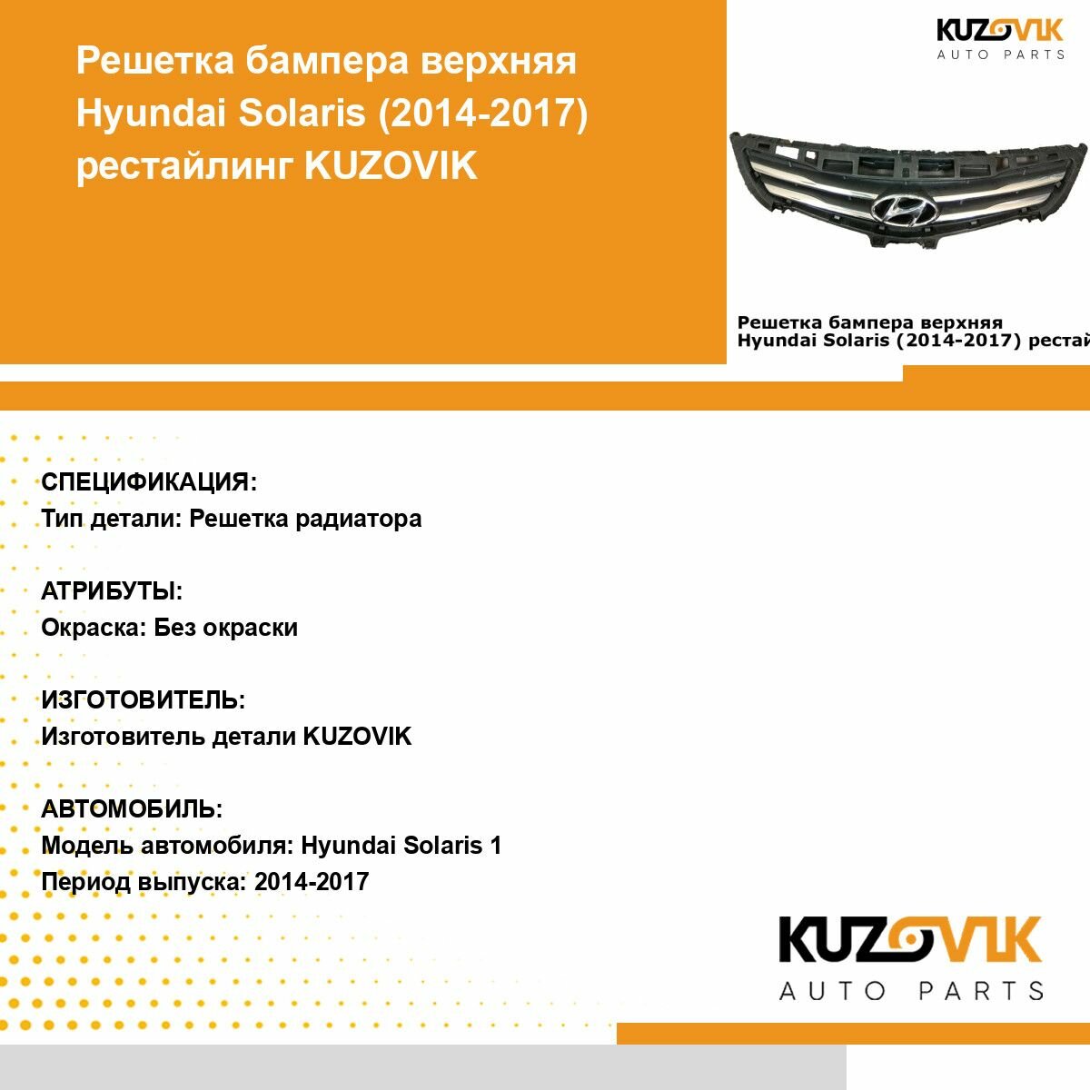 Ниже Вы можете прочитать отзывы на Решетка радиатора Hyundai Solaris 1 Хендай Солярис (2014-2017) рестайлинг с хром молдингами новая заводское качество, ознакомится с подробными характеристиками, посмотреть интересные обзоры и фотографии на Решетка радиатора Hyundai Solaris 1 Хендай Солярис (2014-2017) рестайлинг с хром молдингами новая заводское качество.