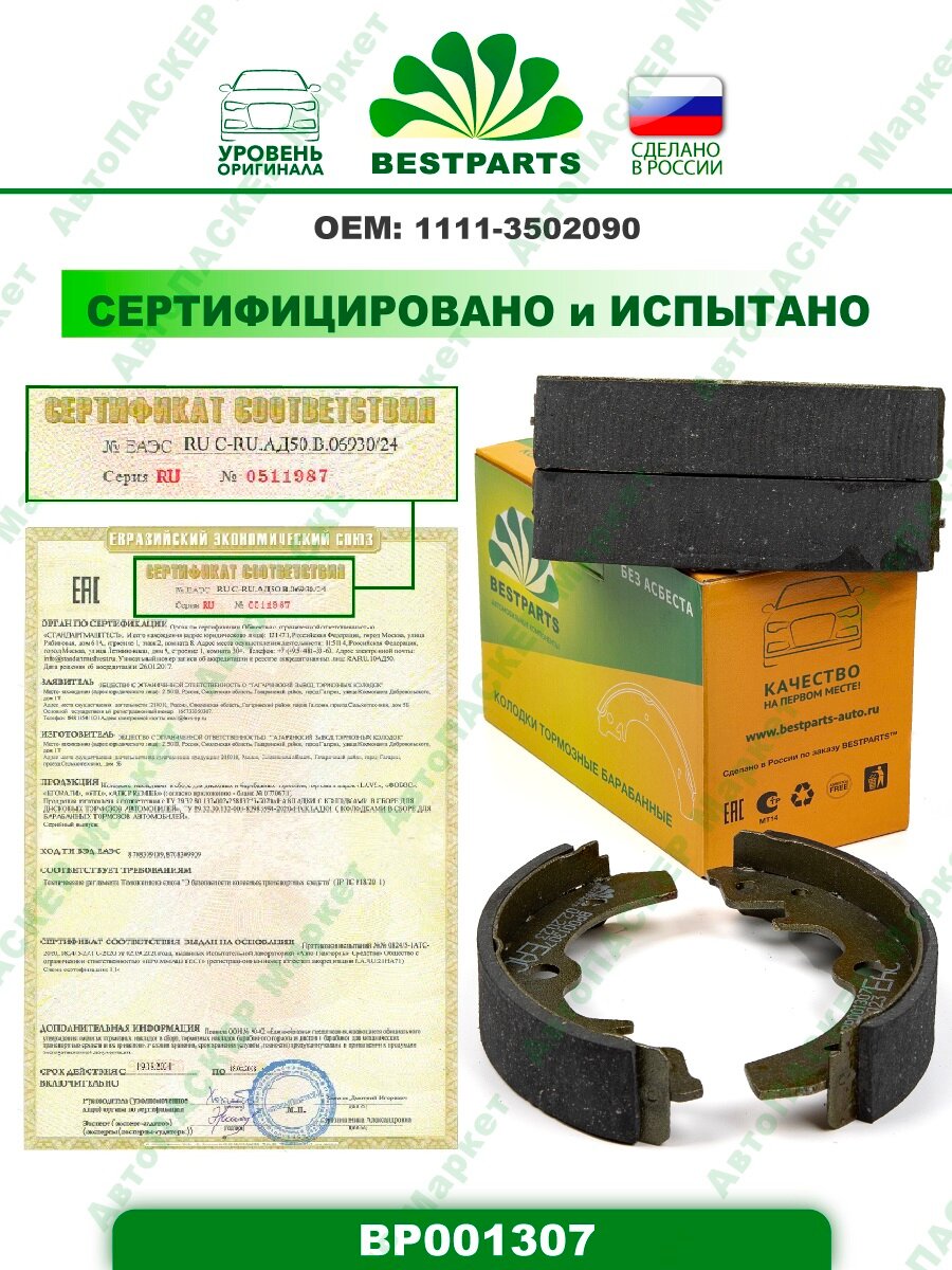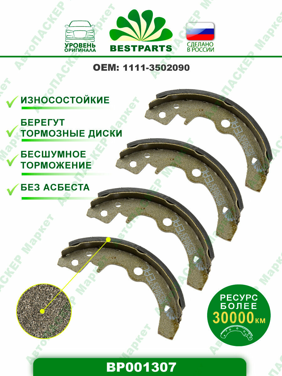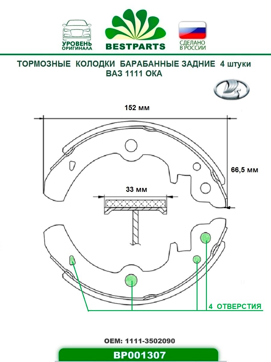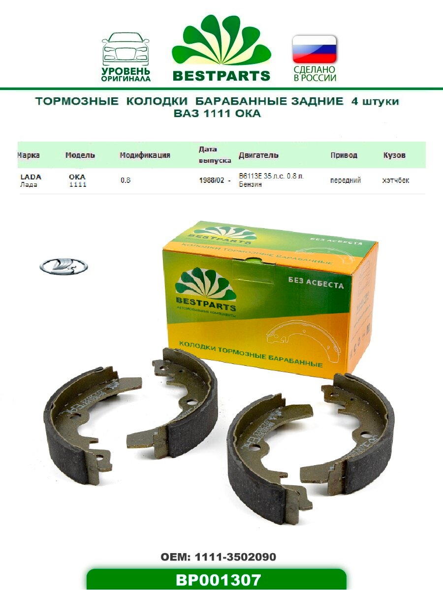 Купить Колодки тормозные задние, барабанные, для а/м ВАЗ 1111 ОКА, 4 штуки, ОЕМ 11113502090, BP001307, 58308