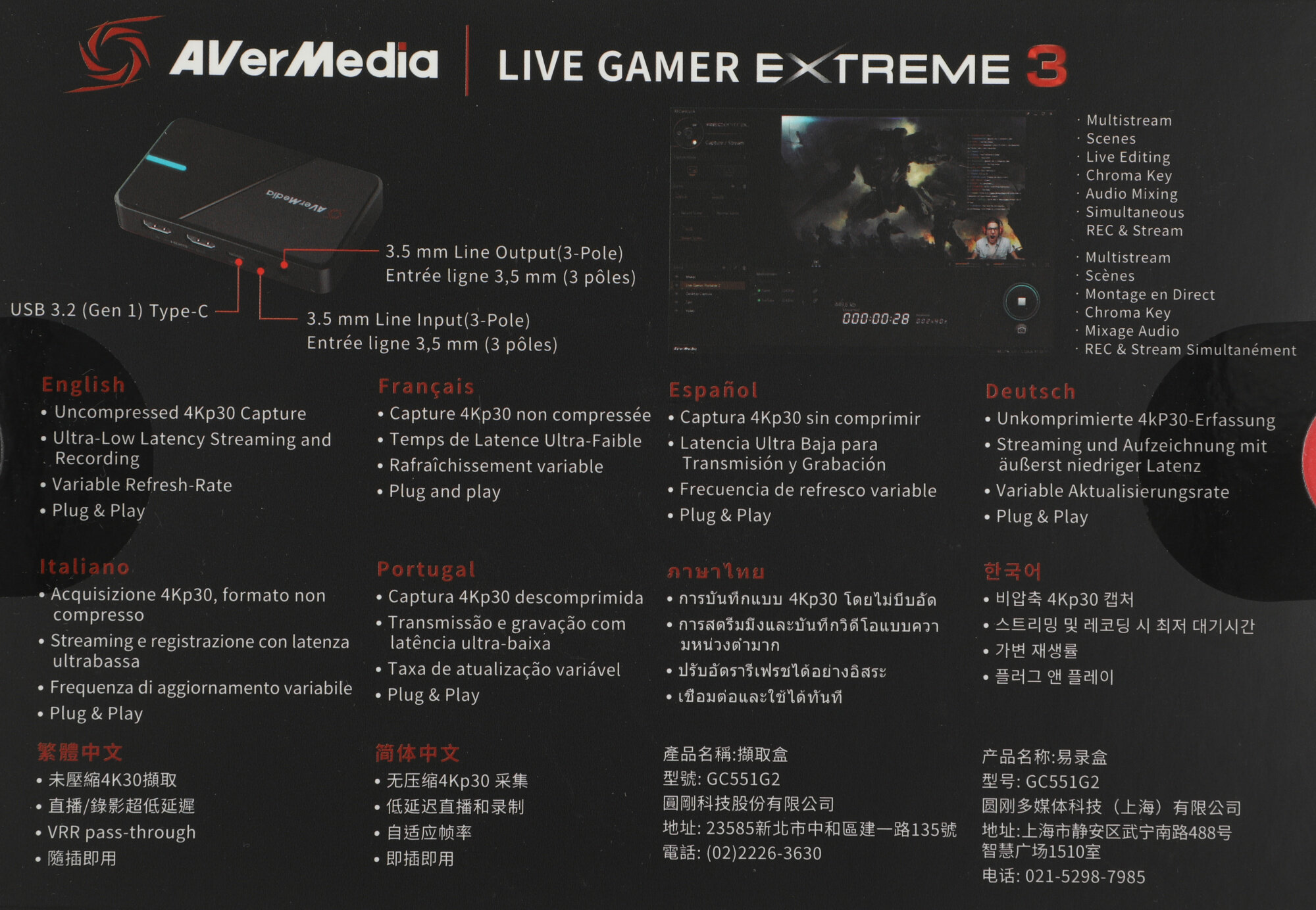 | Комплектация | Live Gamer EXTREME 3 (GC551G2), кабель USB C-to-A, кабль HDMI 2.0, инструкция |