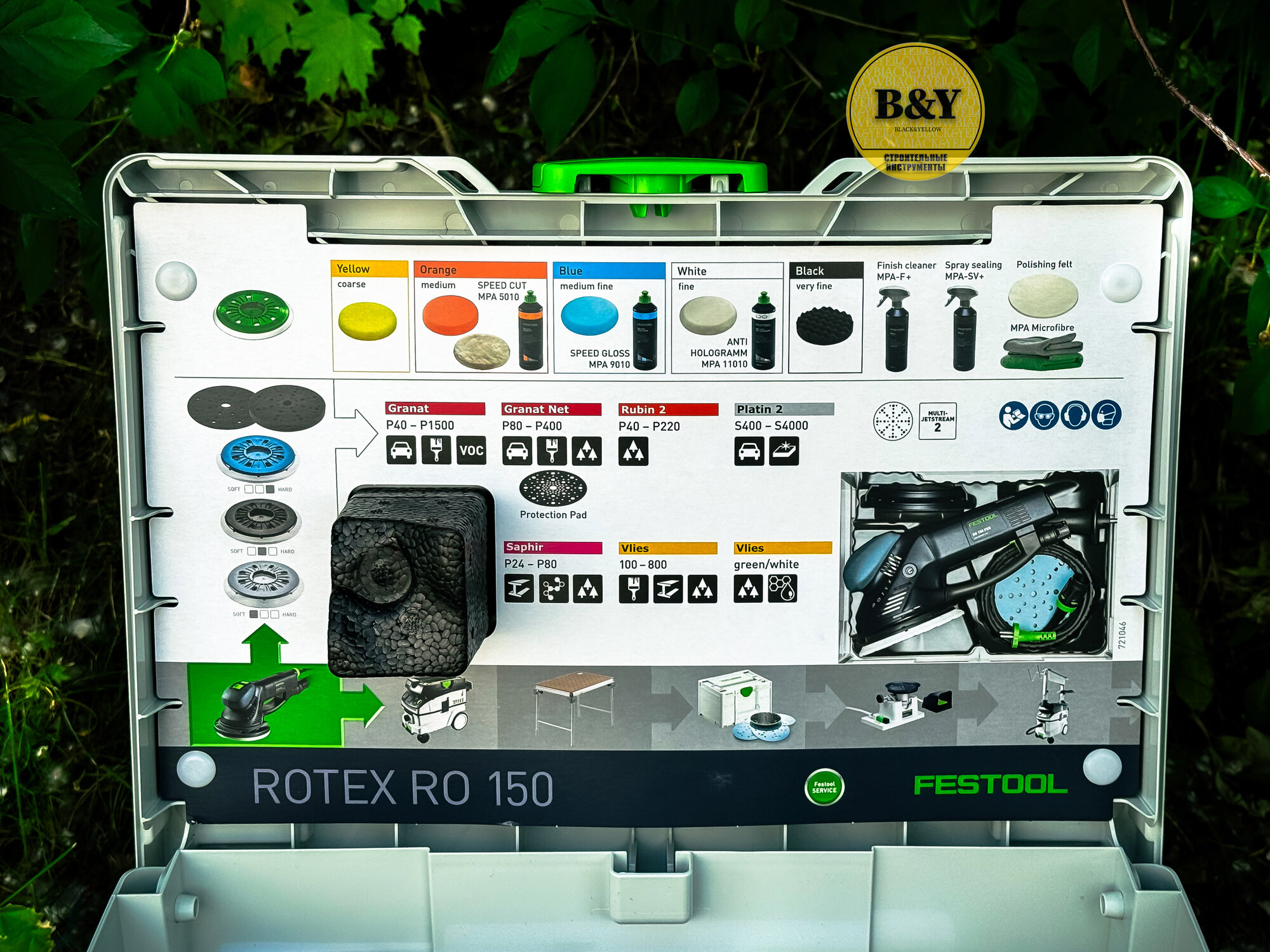 | Комплектация | ROTEX RO 150 FEQ, Шлифовальная тарелка StickFix O 150 мм (мягкая - HT), 1 x абразивный материал Brilliant 2, P 120, Festool PROTECTOR, систейнер |