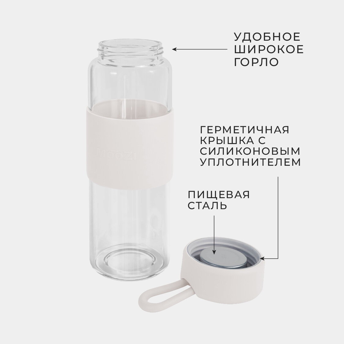 Стеклянная бутылка MOOZI, для воды, 520мл, бежевая, с герметичной крышкой