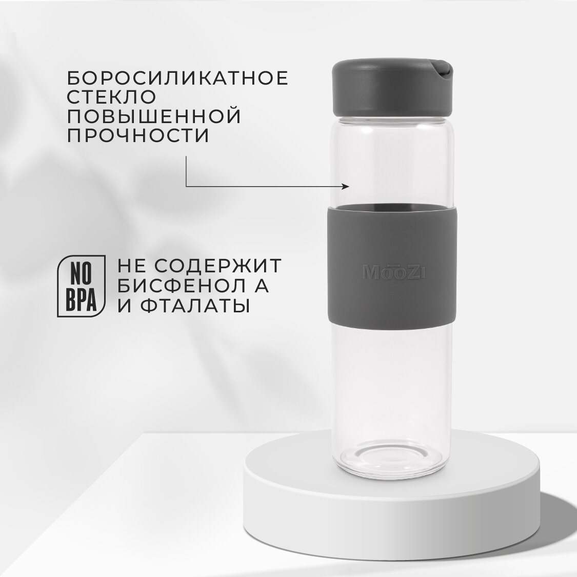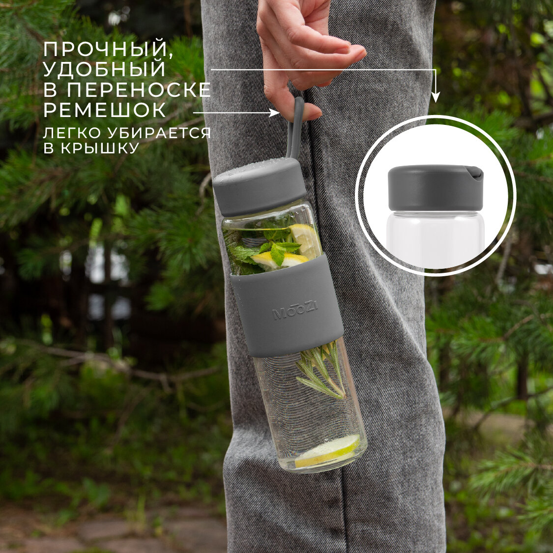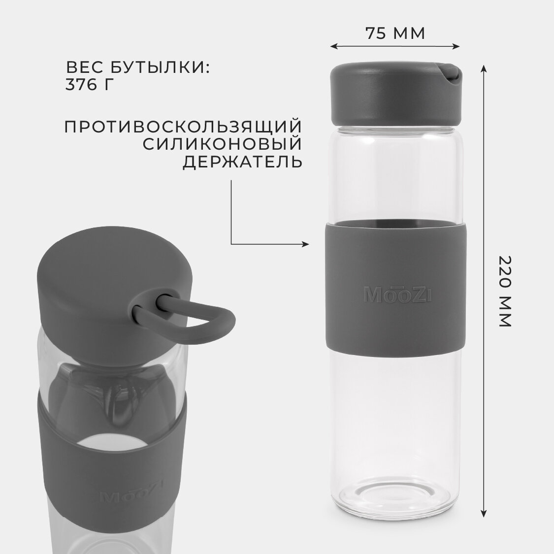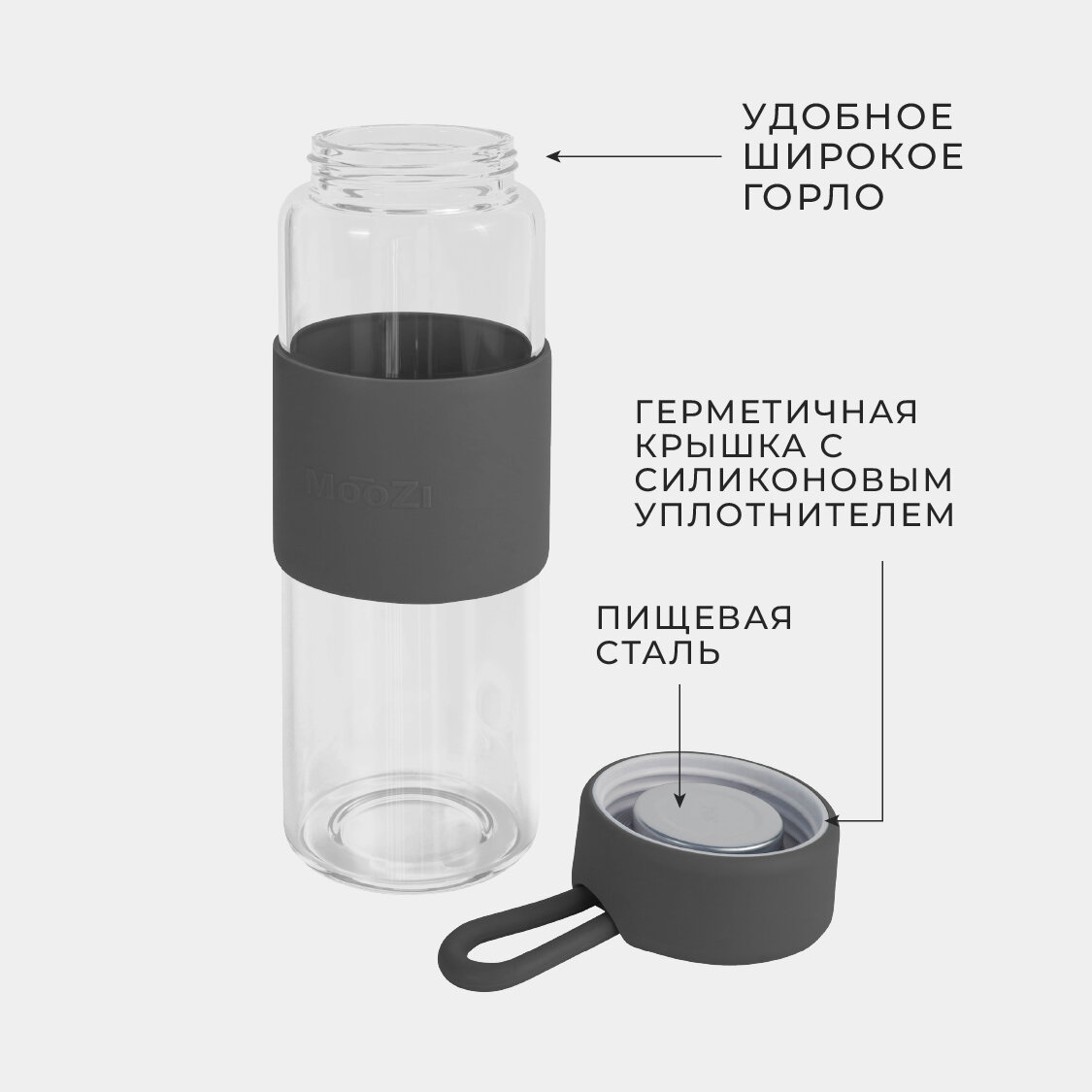Стеклянная бутылка MOOZI, для воды, 520мл, серая, с герметичной крышкой